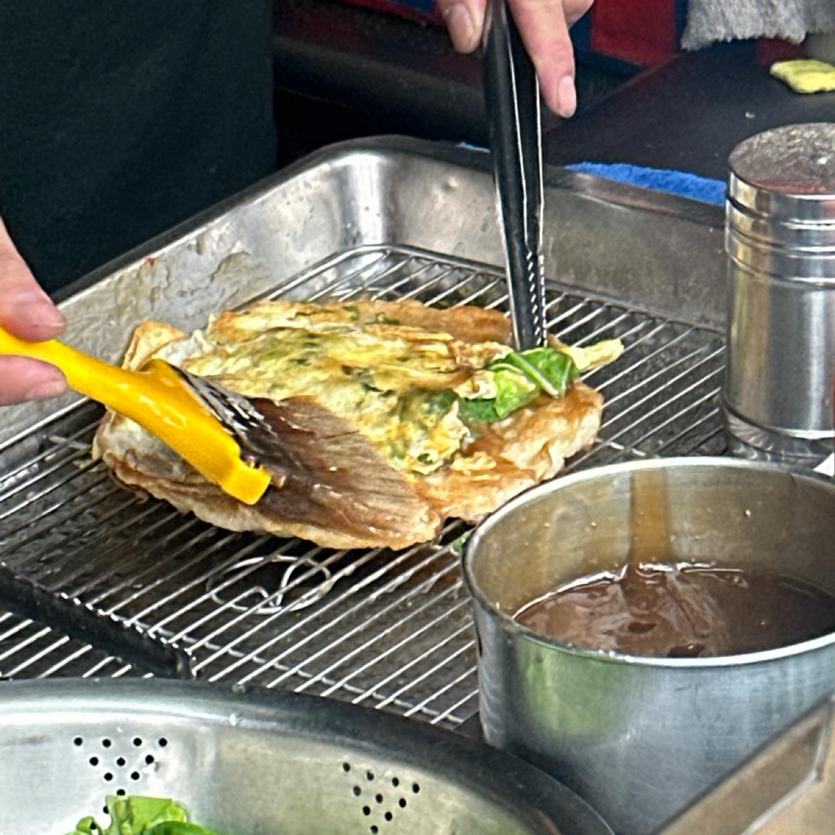 新鮮現炸的蔥肉餅,把攪拌好的蛋油煎後上面灑上小白菜再加上九層塔,最後蓋上蔥肉餅起鍋,刷上油膏香香甜甜與辣的鹹鹹,真的很讚。