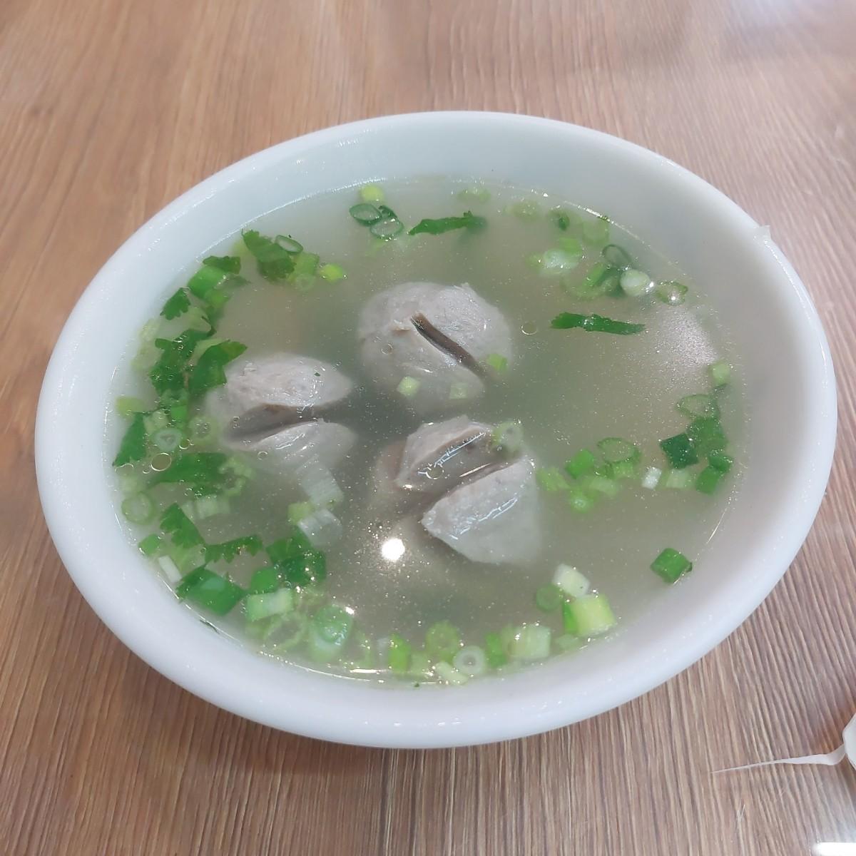 最後是貢丸湯,貢丸有3顆,個頭在貢丸界是偏大的哪一種,湯裡有加切碎的白菜、碎芹菜、香菜,湯頭喝起來有微微的魚湯味,或許是天氣冷的關係,這個熱湯是這餐感覺最好吃的一道餐點,滿分10分給6分。
