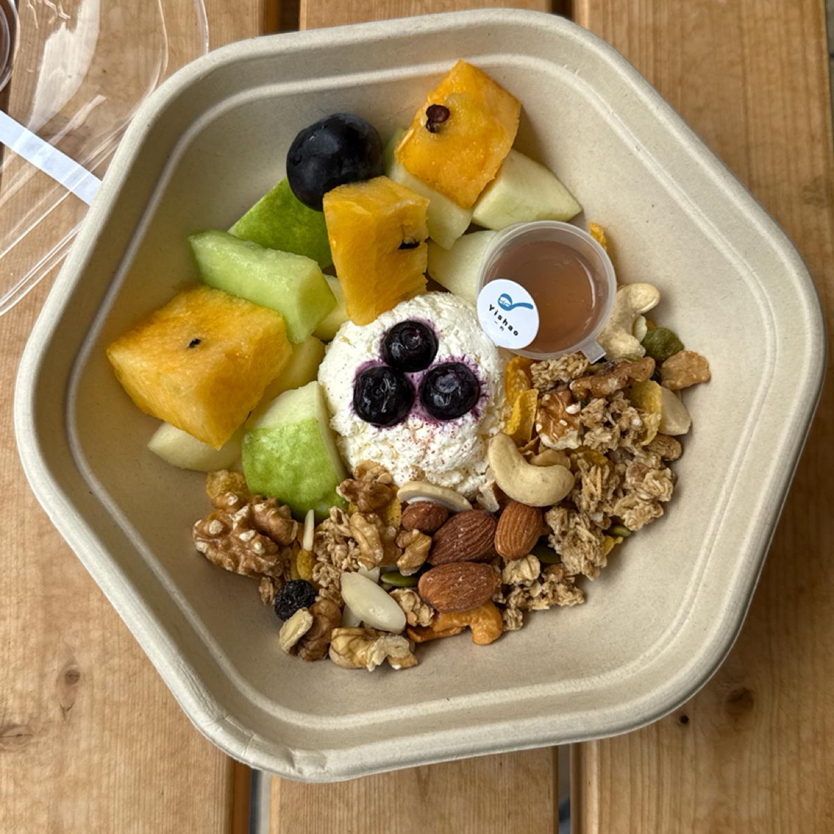 配料部分也令人滿意。水果都非常新鮮,當天吃到的有芭樂、香瓜、西瓜與葡萄,色彩繽紛、口感清爽,與濃稠的優格形成絕妙對比。堅果與穀物則包括杏仁、腰果、核桃與麥片,種類豐富、口感層次分明,不僅增加咀嚼感,也讓整體營養更均衡👍🏻