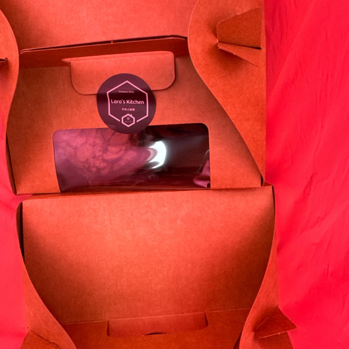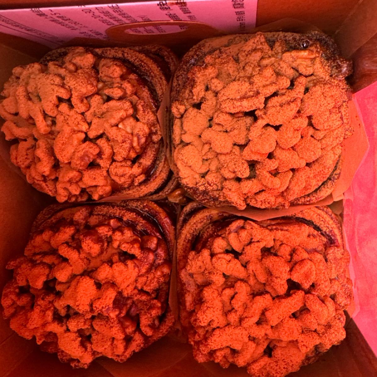 肉桂捲讓醇厚肉桂黑糖漿淋浴上頂部偏濕潤,核桃份量大氣增添整體口感! 一打開盒子濃郁的肉桂香撲鼻而來,肉桂捲是薄皮的。核桃有淋上醬放在最上面。 下半部麵包體吃起來鬆軟,肉桂辛辣味較重,(喜愛濃郁肉桂派的會吃得很過癮)