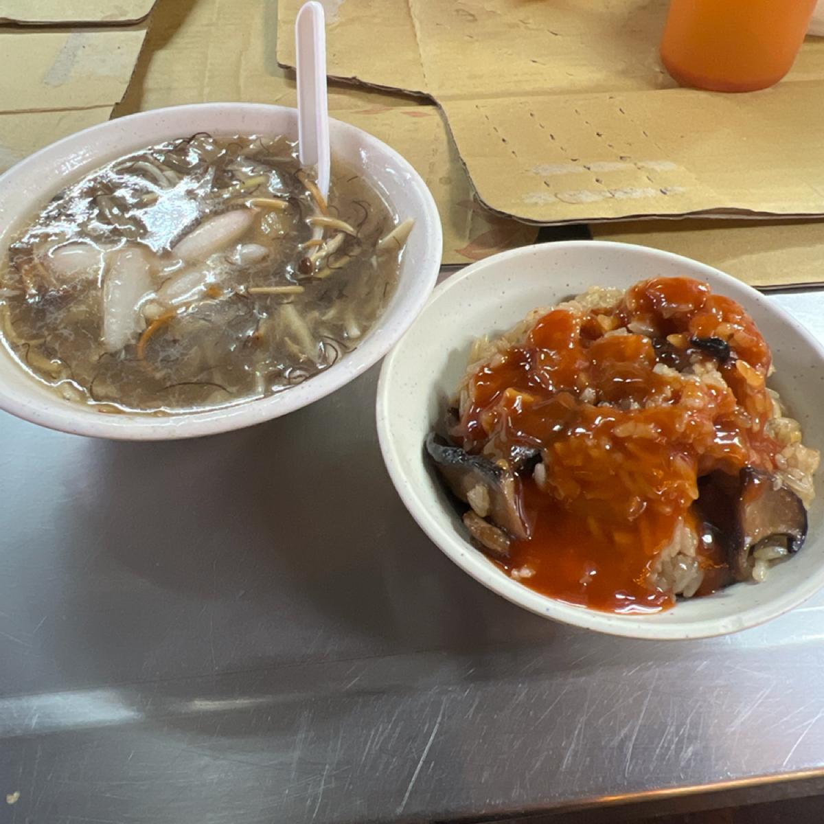 星期日晚上開的店不多,生意最好的就是這間了,但是連隔壁攤位的座位也可以做所以其實還滿快的,環境不奢求基本還可以。 油飯配羹湯,油飯軟硬適中搭配辣醬真是完美絕配啊~分不清是油飯配醬還是醬配油飯了啊哈哈哈。羹湯稠度鹹度適中,搭配一點胡椒粉更加分,標準來就是一套一套的點。