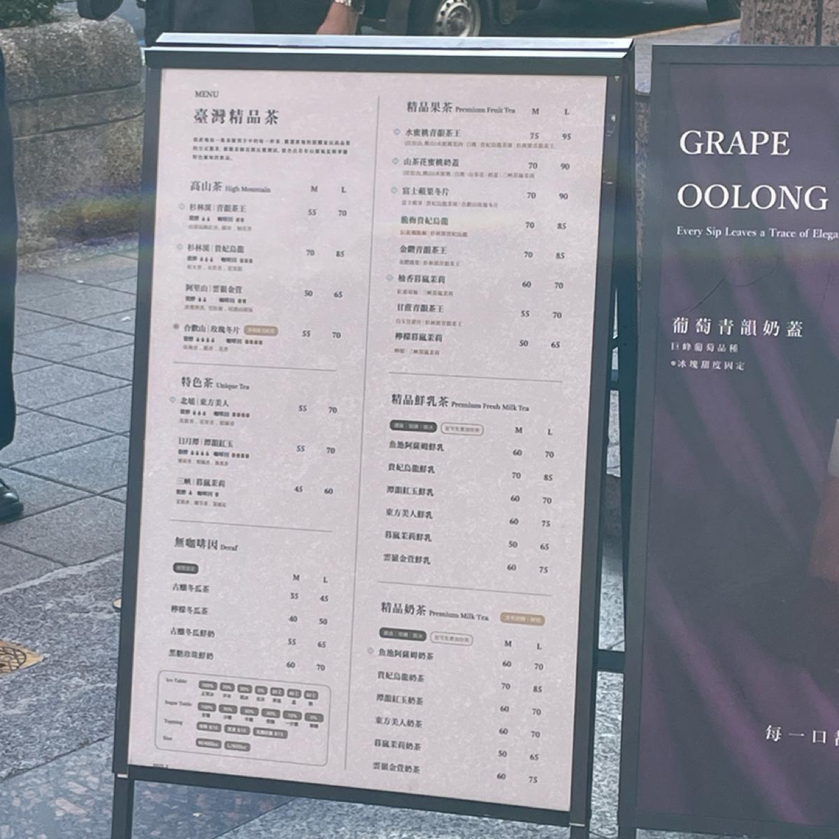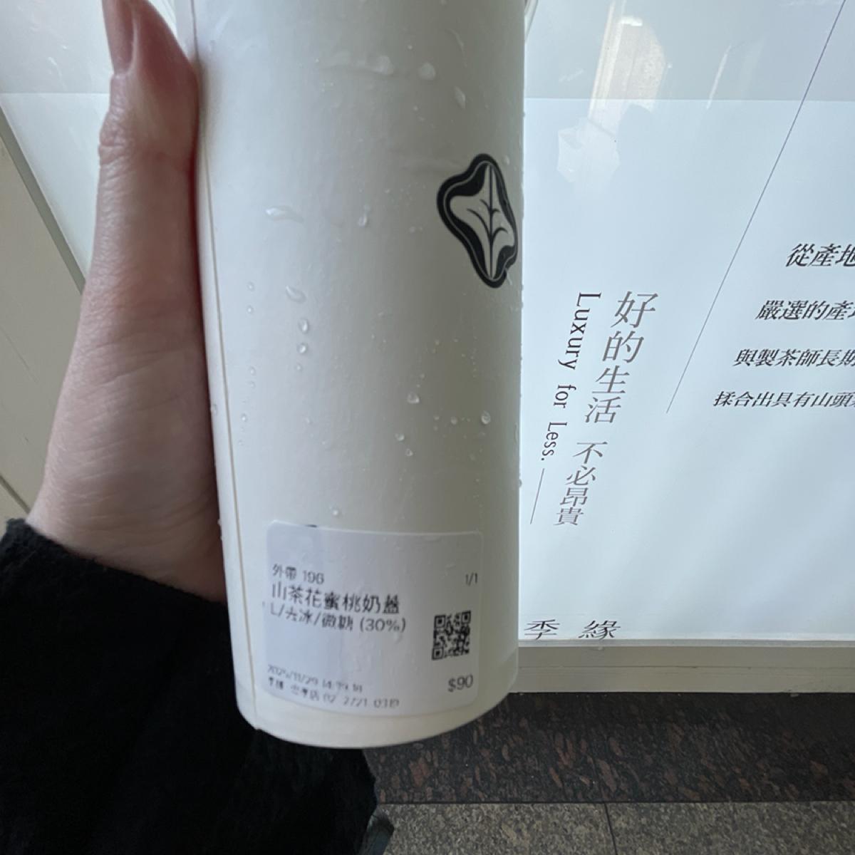 去的時候大排長龍,人超級多,雖然人潮眾多,但工作人員態度還是不錯的,大概排了20分鐘左右,好處是給我很多的猶豫時間,我在水蜜桃青韻茶王、山茶花蜜桃奶蓋之前搖擺不定,後來還是先選了山茶花蜜桃奶蓋,店員說是冰沙的感覺,但還是可以調糖冰,點了微糖去冰。