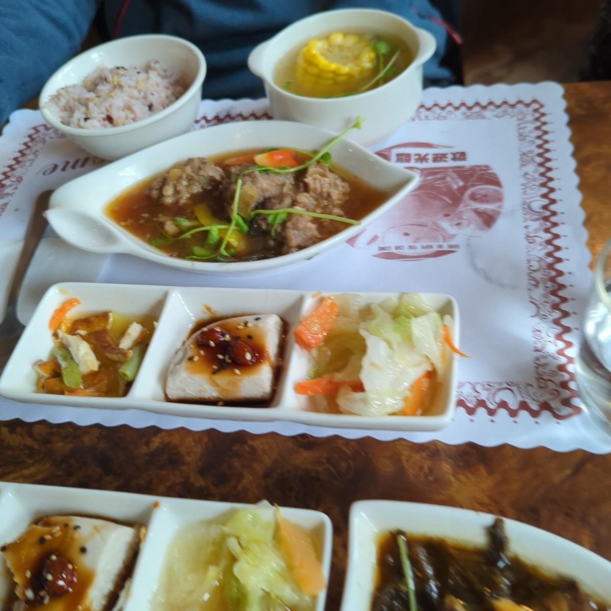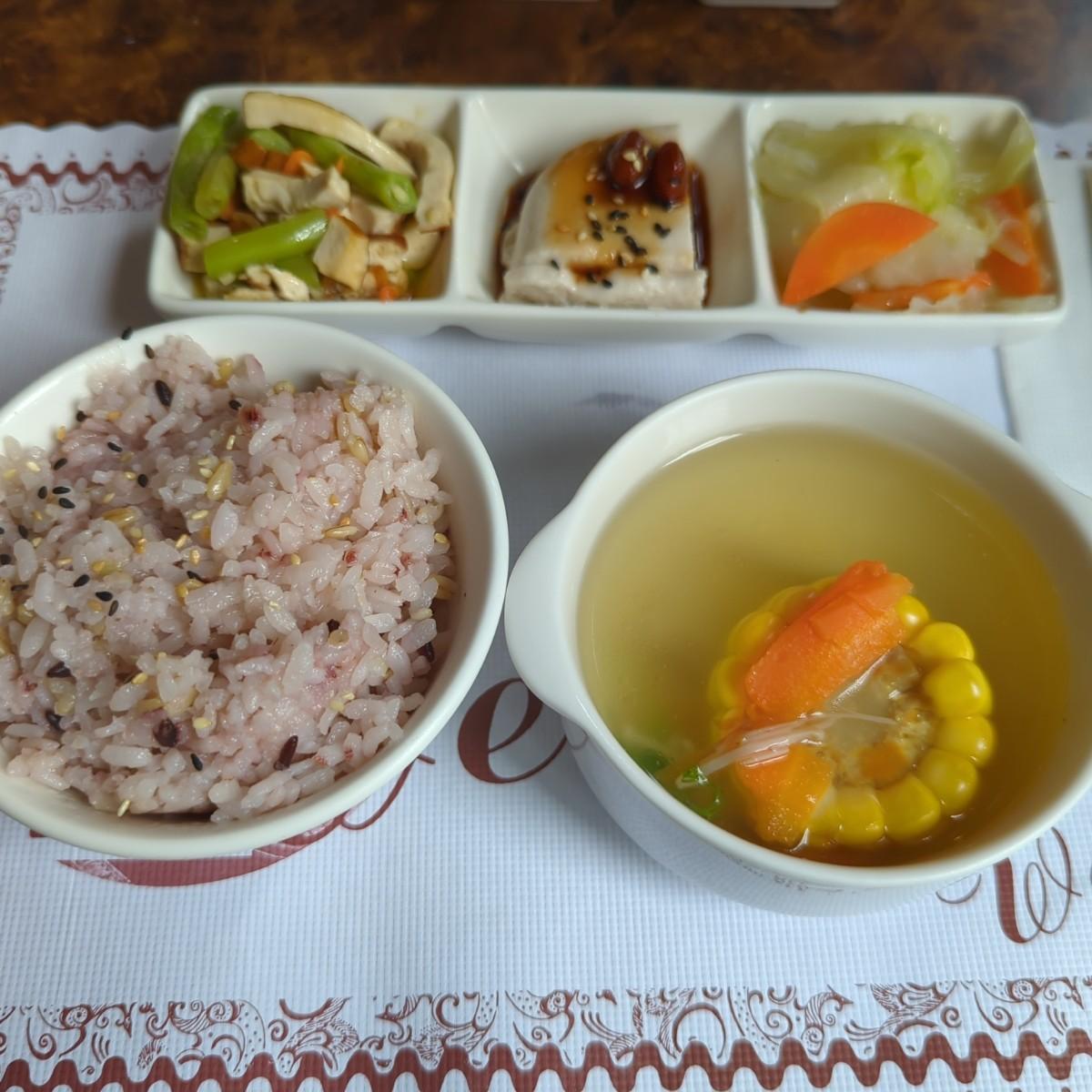 套餐還包括3樣小菜和湯, 配上五穀飯, 很均衡的飲食. 附贈飲料選了熱「薏仁漿」, 溫暖脾胃.