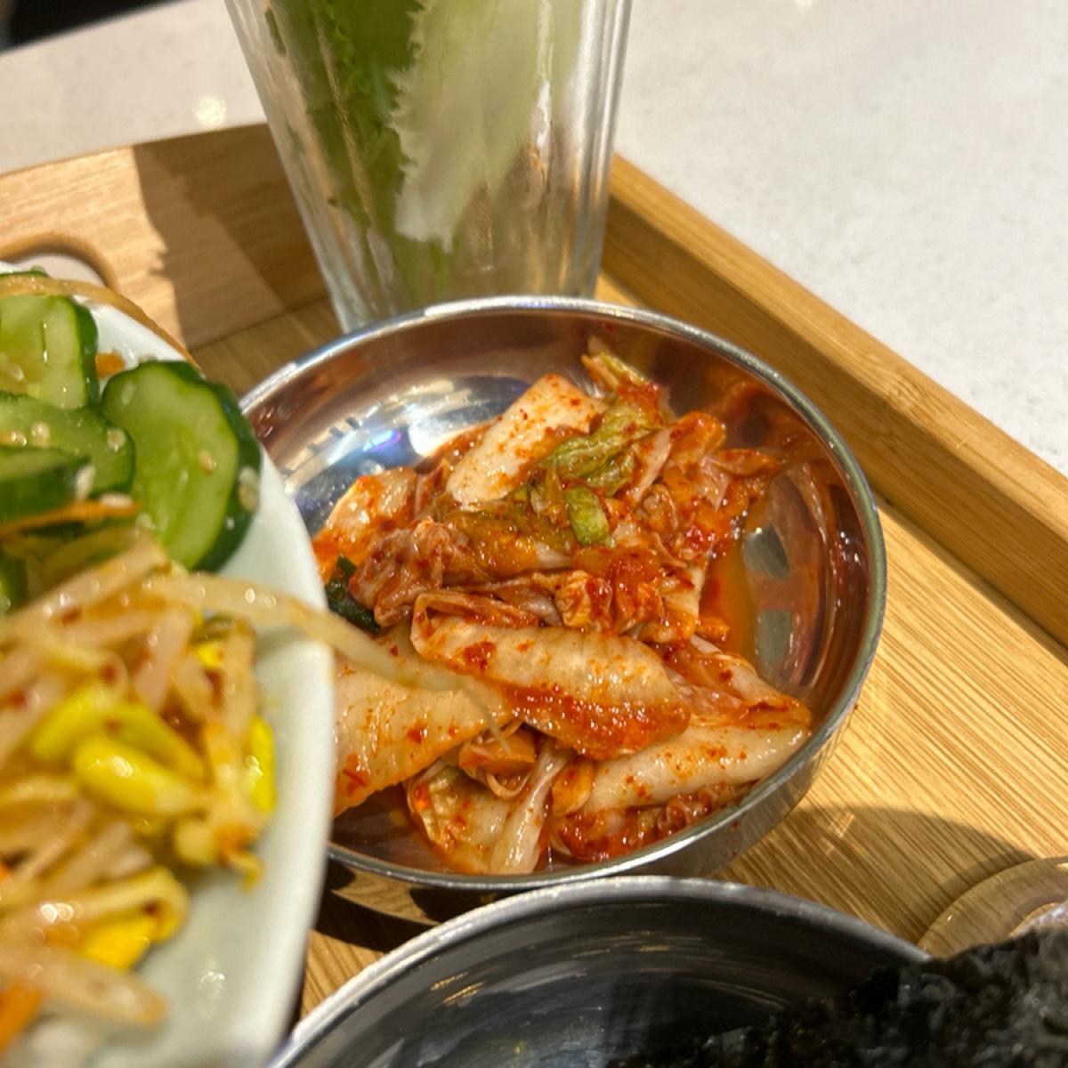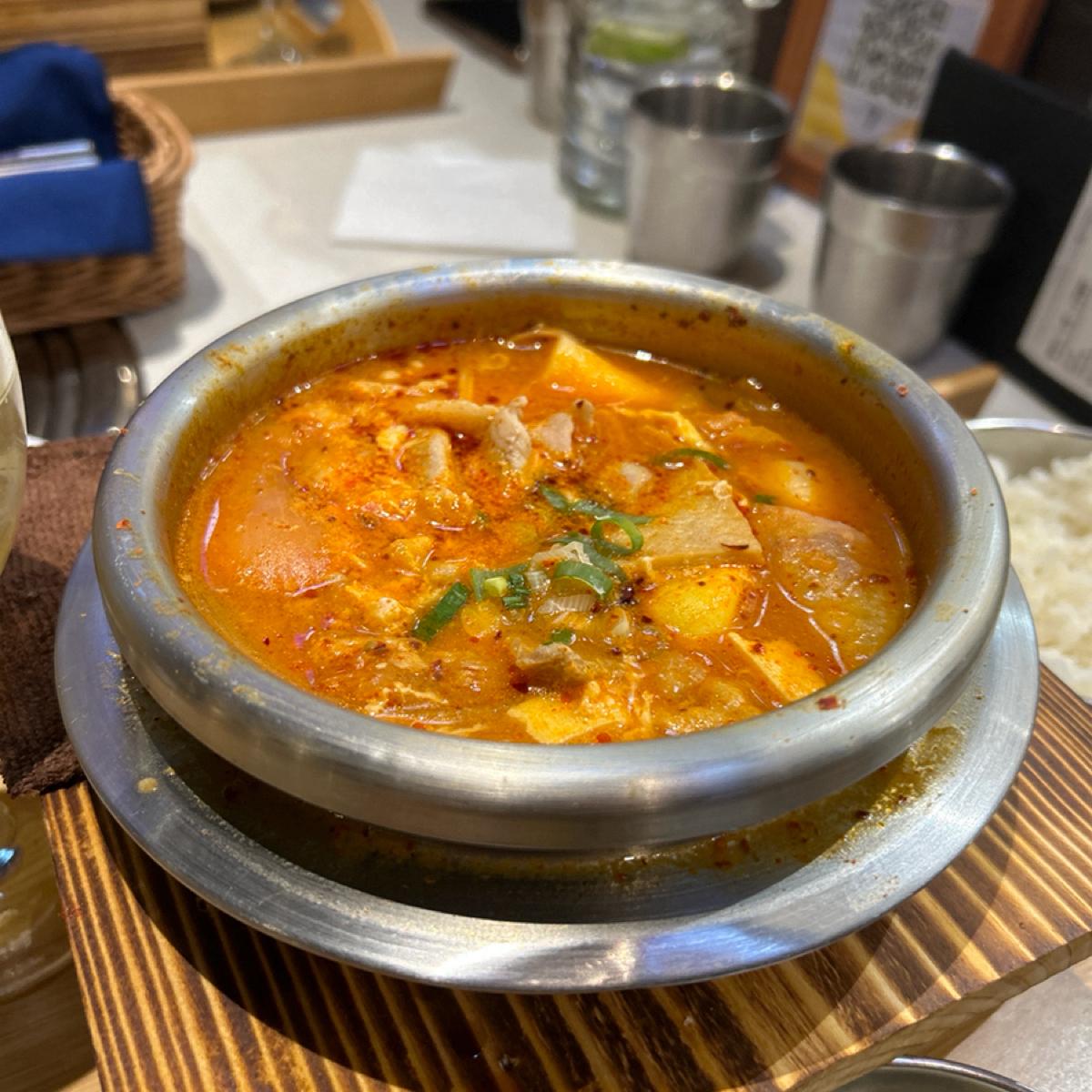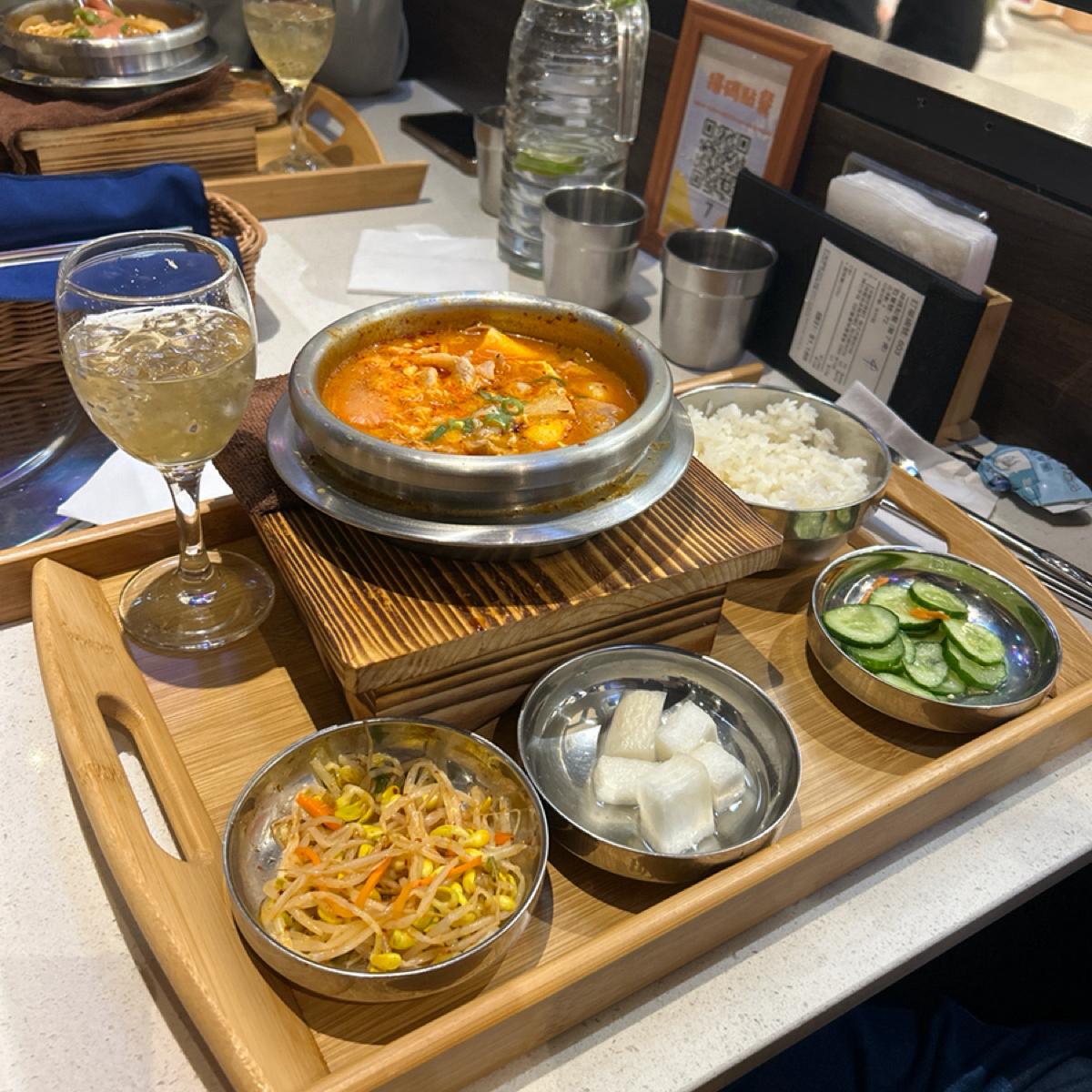 🇰🇷韓國泡菜豬肉鍋裡面有很多料,像是年糕、豬肉片、雞蛋、泡菜、金針菇,湯頭有些許辣,可以配飯吃。旁邊附的醃漬白蘿蔔吃起來偏甜,小菜基本上都無雷。