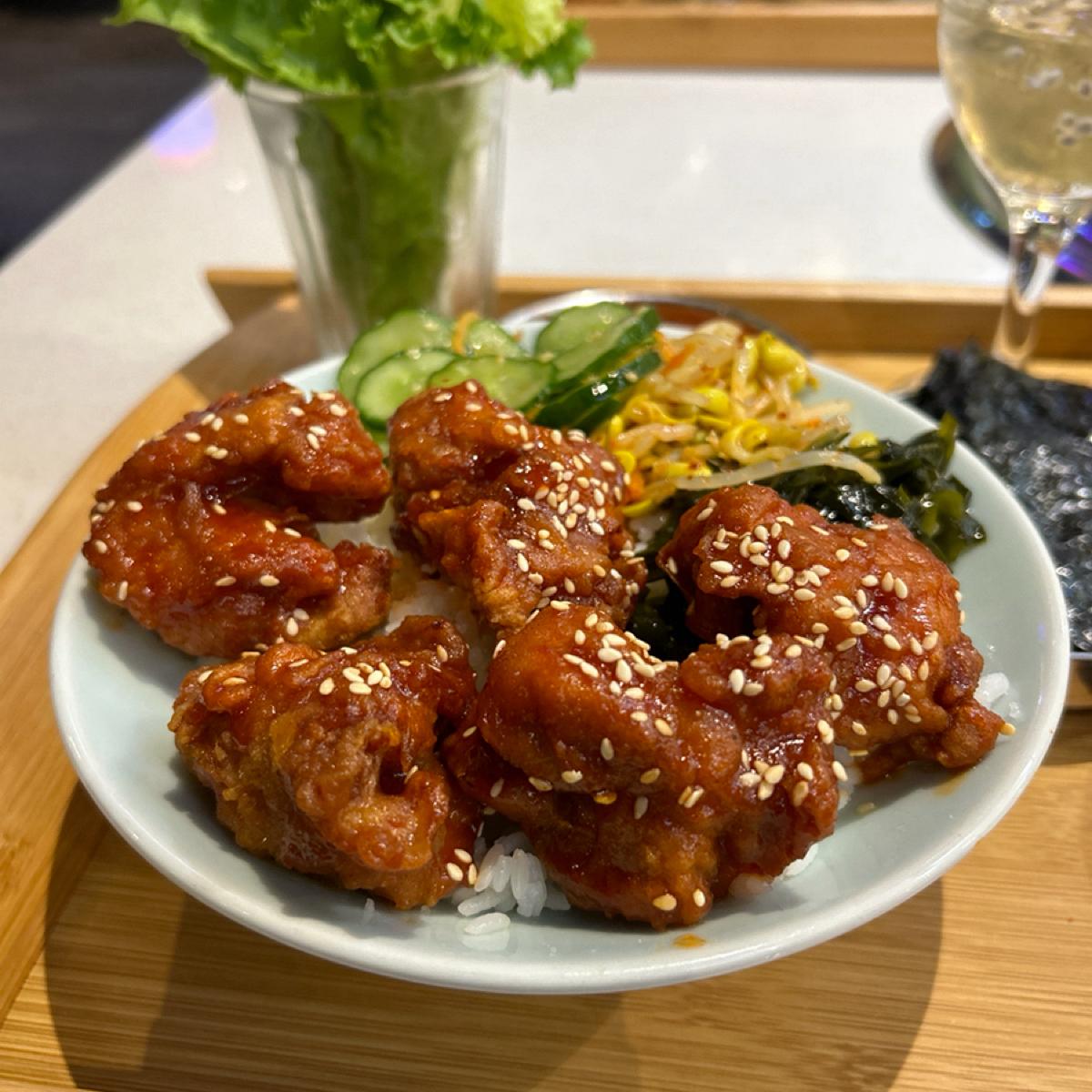 🐔洋釀呿啃飯上面放的炸雞有夠香,吃起來脆脆甜甜的,可以包成海苔飯捲,也可以包生菜吃,好讚!🤩
