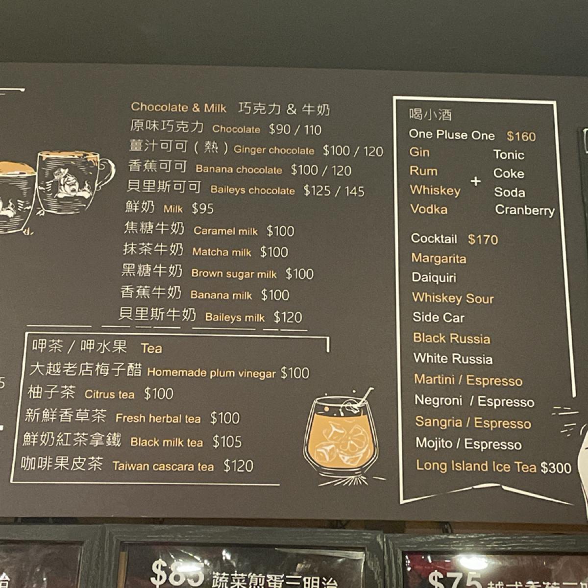 咖啡系列和牛奶系列等無酒精飲品幾乎都是$100左右,酒精飲品也不到$200,在台北東區看到這種價格,真的覺得老闆也太佛心了吧~~