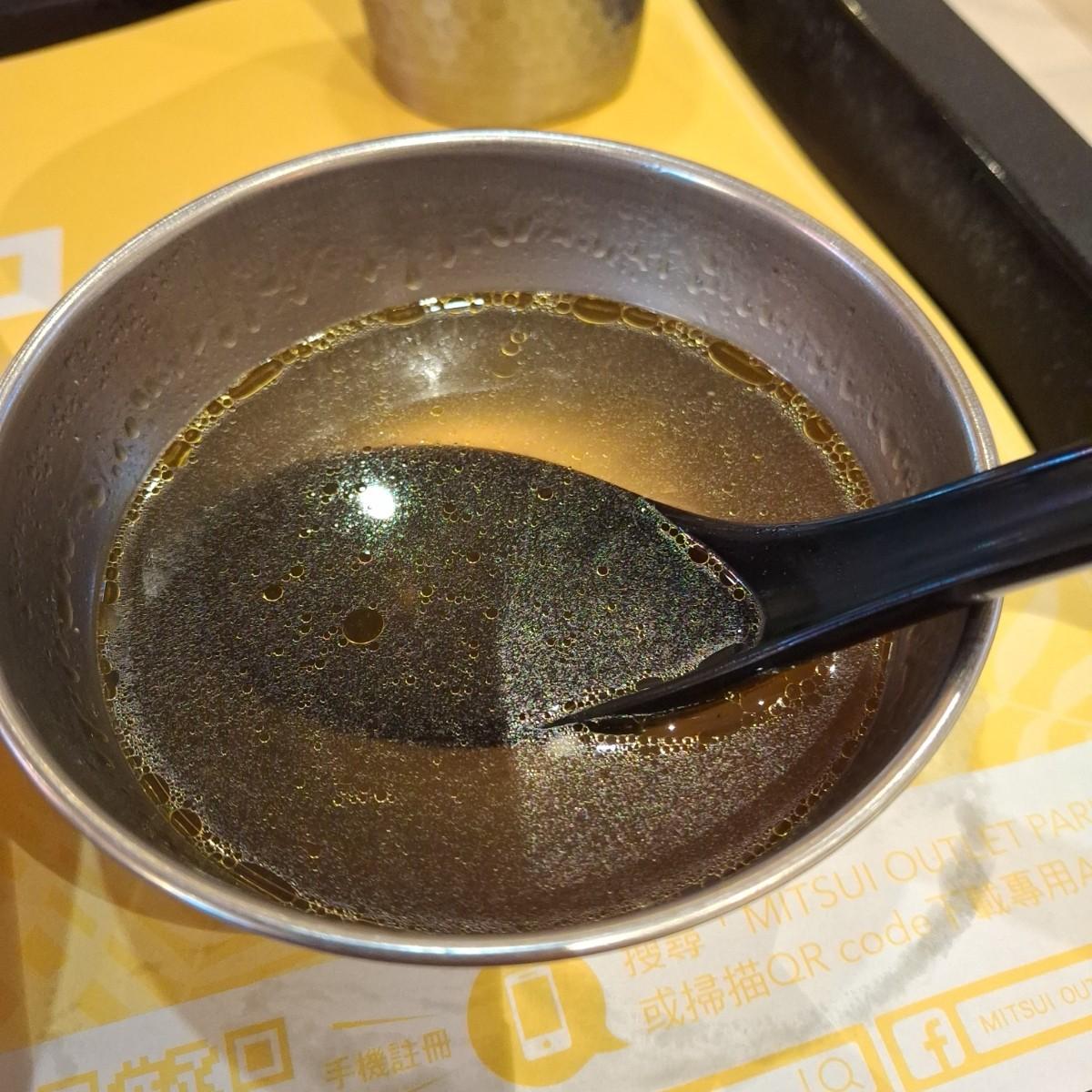 湯的部分沒什麼料,就是很簡單的清湯,調味有淡淡的鹹,喝下去可以幫忙舒緩麵跟豬排帶來的乾澀。