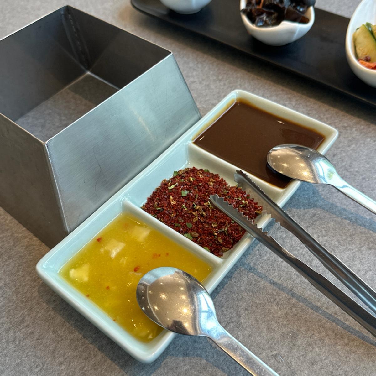 配料:蔥段、大黃瓜絲、特製甜麵醬、享鴨花椒鹽、季節蘸水(水果調製)很酷