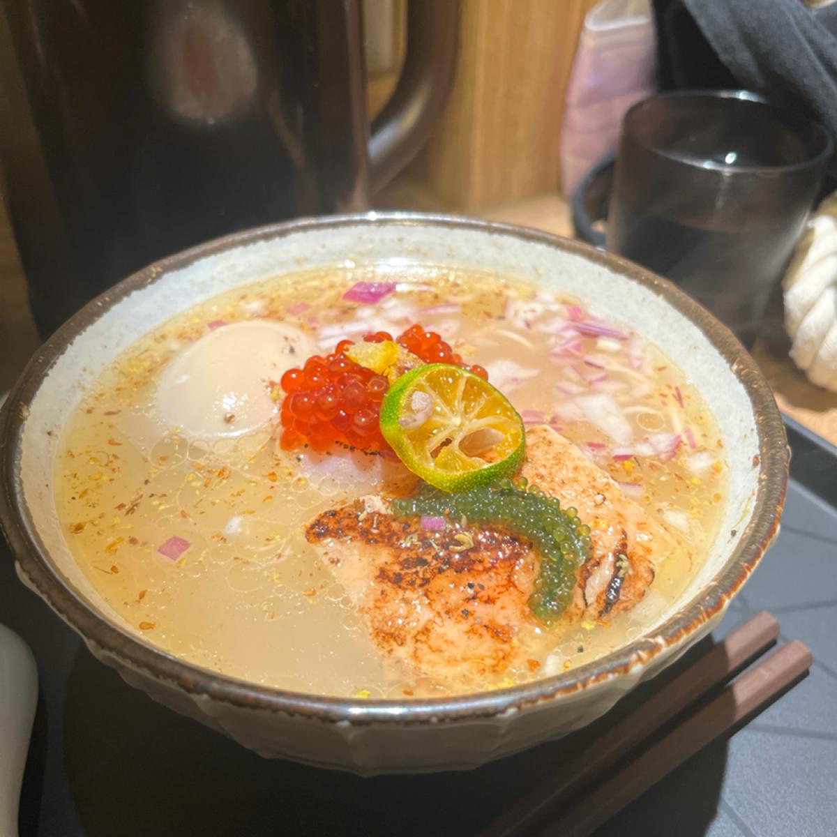 這碗走的是清爽優雅路線,柚香的果酸與桂花的清甜交織,入口時淡雅不膩,搭配的海葡萄、鮭魚卵和炙燒干貝則提供了鮮味的支撐,一整顆溏心蛋和雞腿肉依舊維持軟嫩水準,相較於雲丹雞白湯的濃郁一體,這碗更像是「分層享受」——清香、甘鮮與香氣各自分明,適合偏好清爽系的食客。