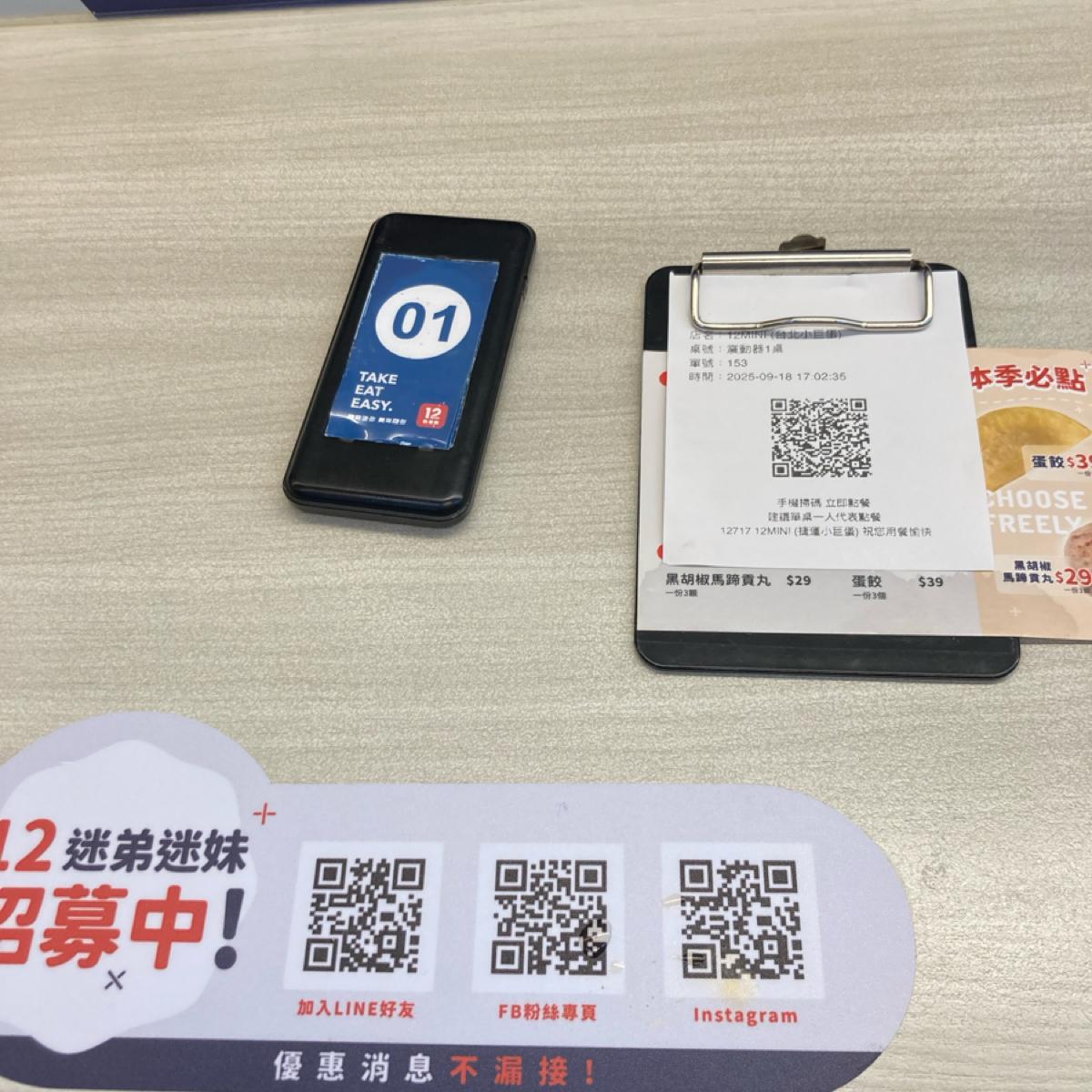 內用座位不多,入座時在門口自行取點餐碼和呼叫器,掃碼點餐送出後,等待呼叫器震動取餐。