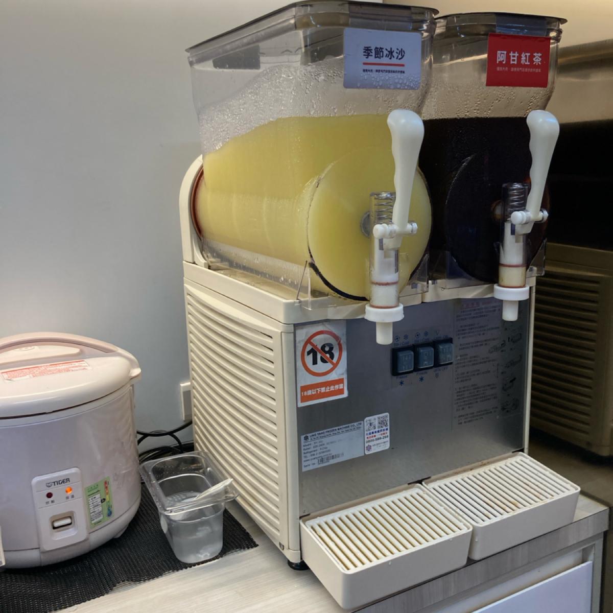 內用有飲料、白飯可以無限取用,飲料還有兩種,但都偏甜,我這天的飲料是紅茶和冰沙。餐具自行取,有小碟子可以裝醬料,醬料有沙茶醬、生辣椒、白醋、醬油。