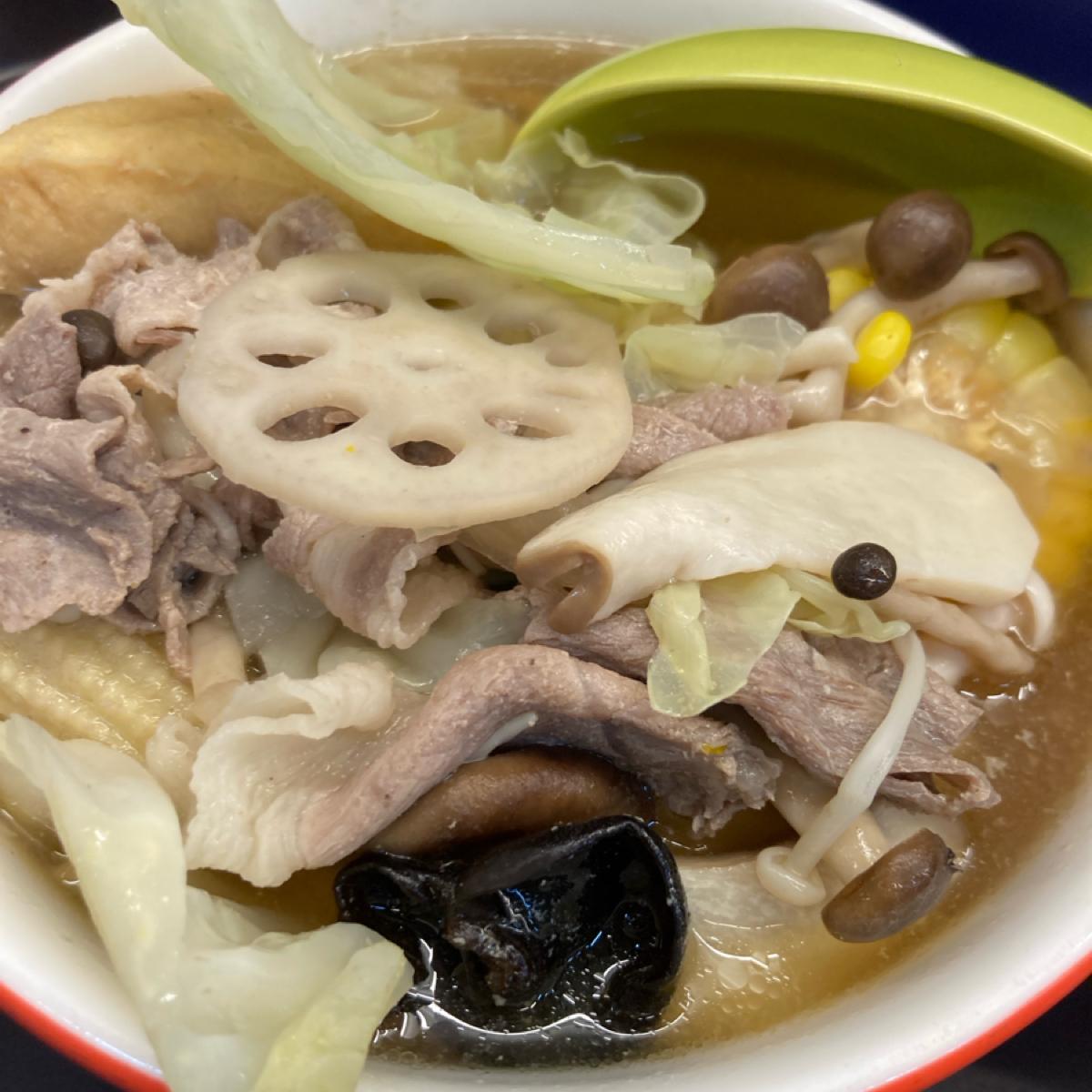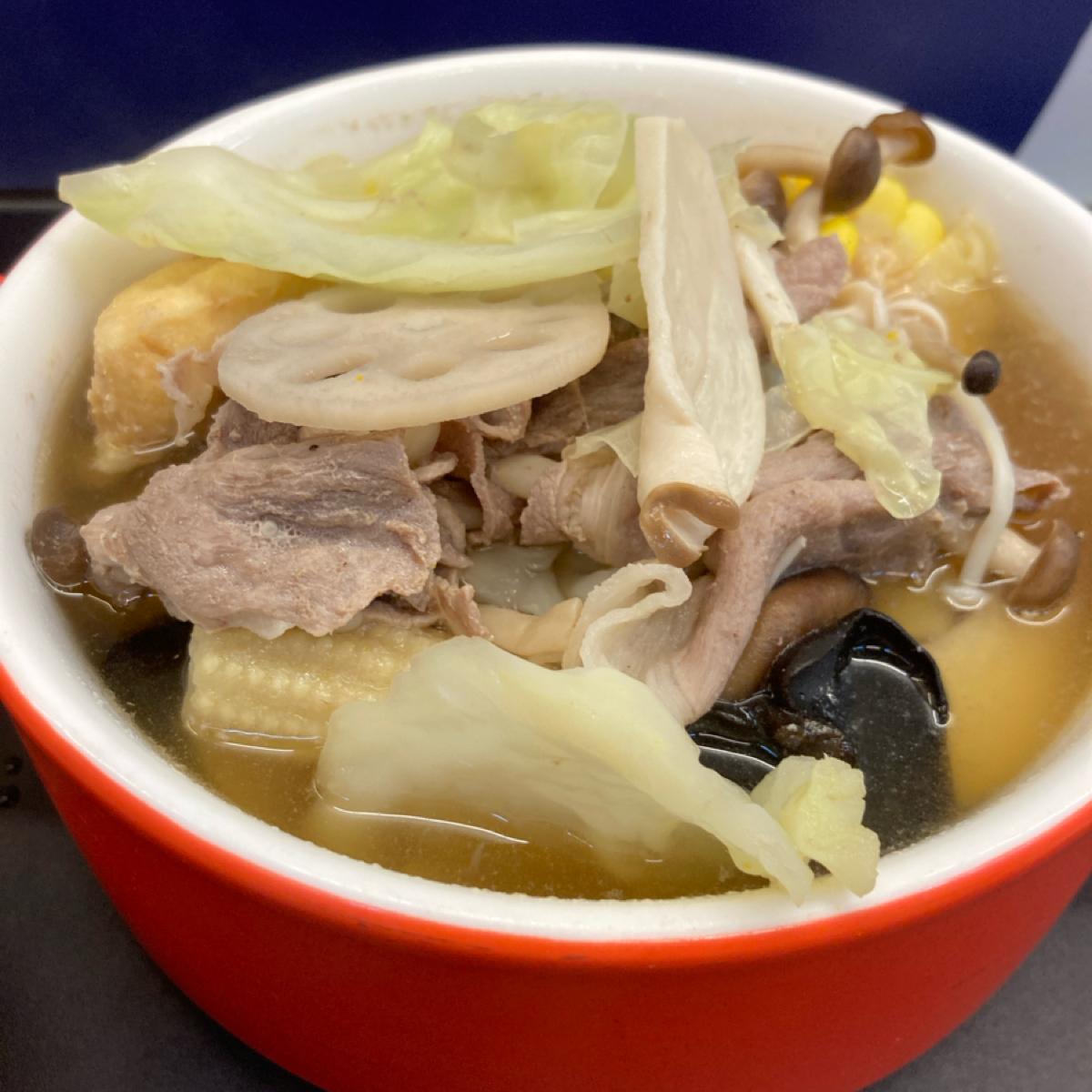 單點個人鍋但料很豐富,我點的料底是菜菜好,有高麗菜、玉米、南瓜、蓮藕、玉米筍、木耳。湯頭不錯喝不會過鹹,喝完沒有覺得特別口渴。