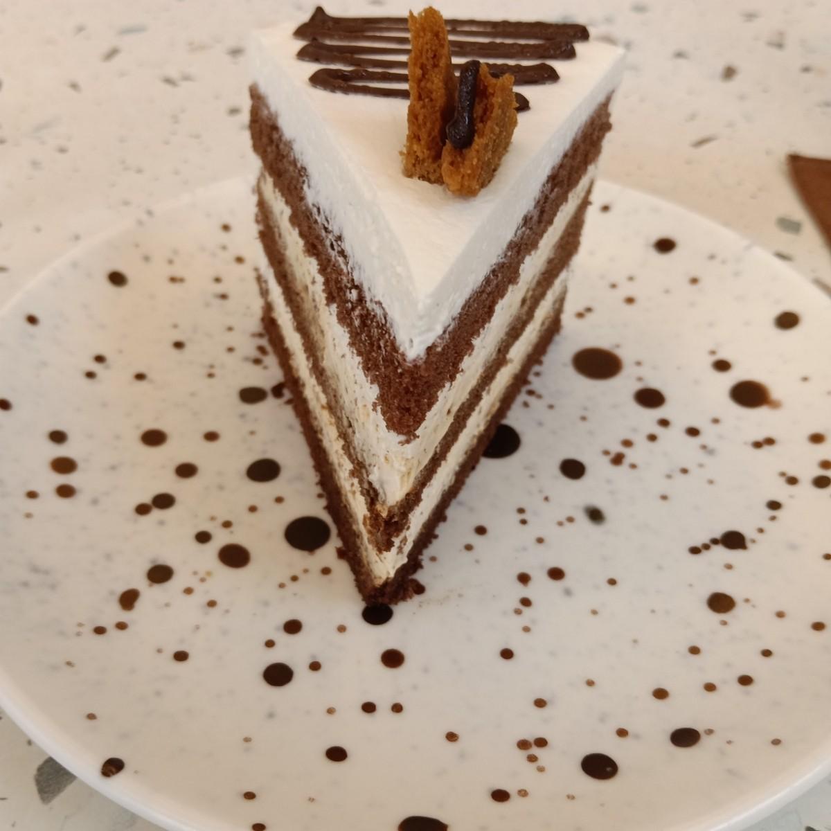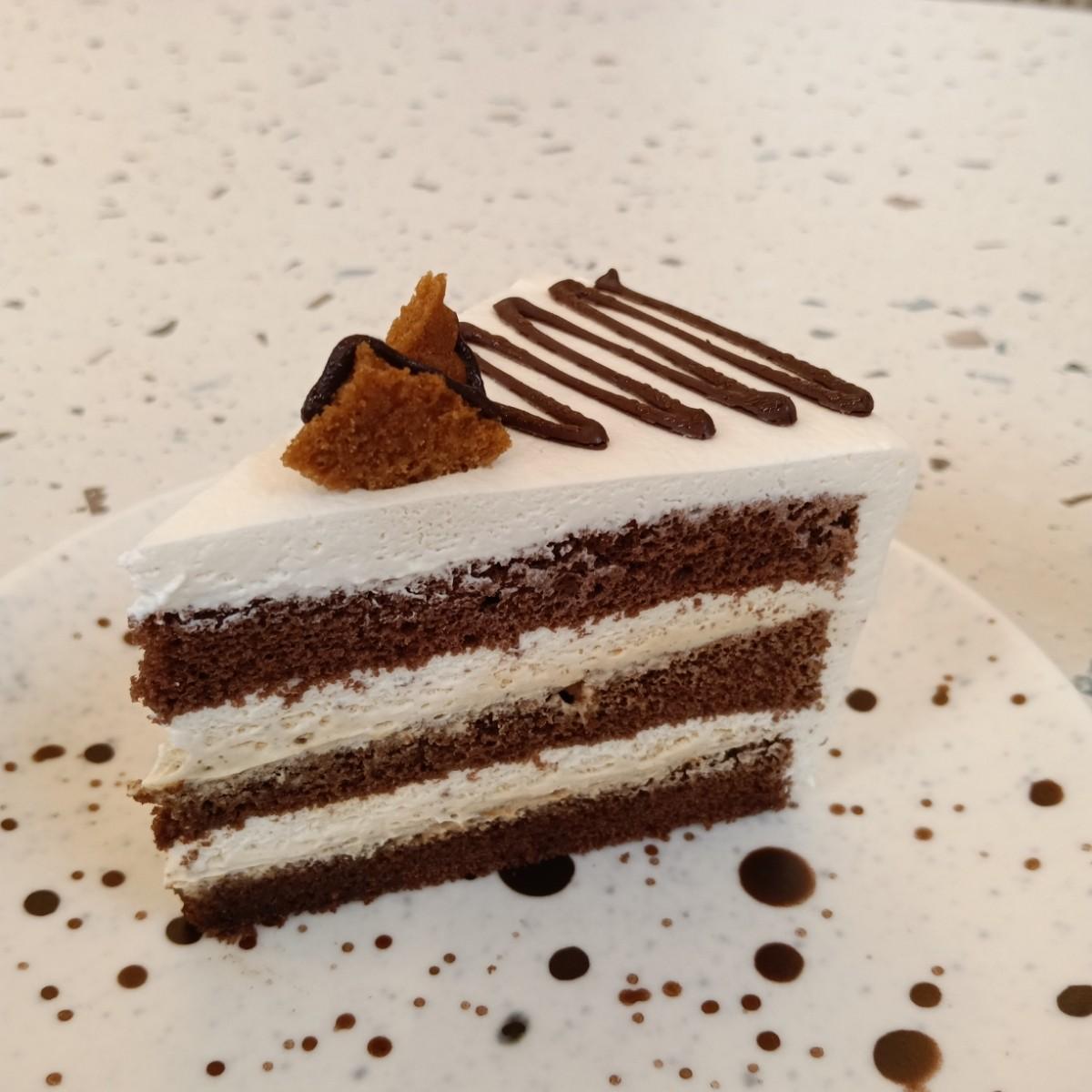 蛋糕上層擺放著一條又連接好幾條的小巧克力塊,而且白色與咖啡色都是不同層次般混搭三角形狀的模樣,吃上每一口,可以感受到巧克力蛋糕焦糖味 ,海鹽就像是奶油濃郁滑順充滿甜味,屬於一種特別類的口味
