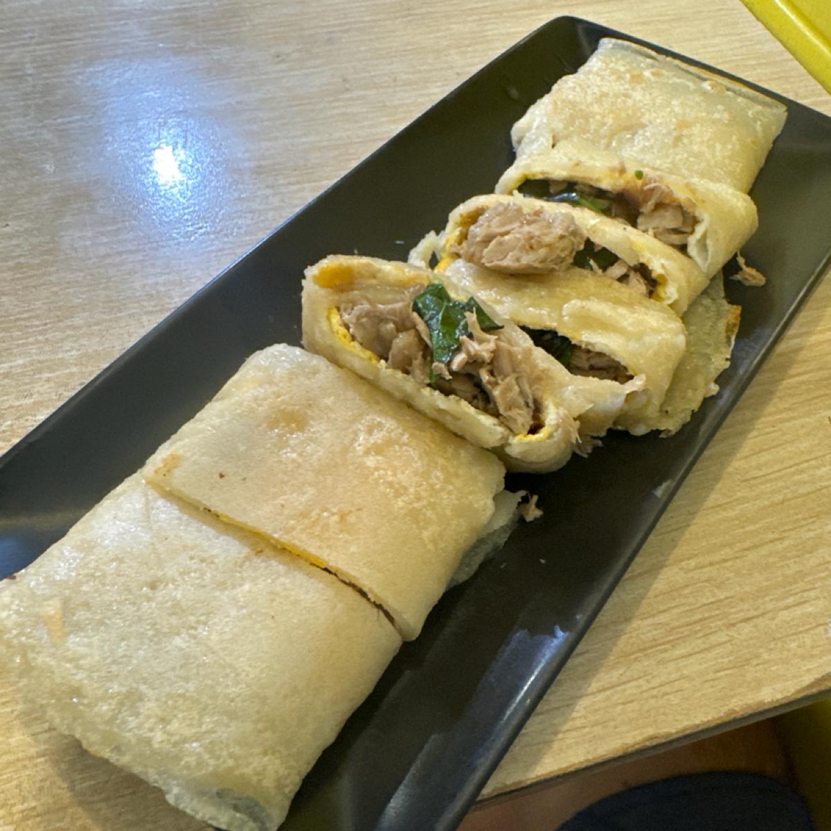 蛋餅有兩種餅皮,大推燻雞腿肉脆皮餅皮,他的燻雞非常香搭配上酥脆的蛋餅皮卡滋卡滋,很有口感也很好吃,粉漿也不賴,糯糯的也是很有口感。