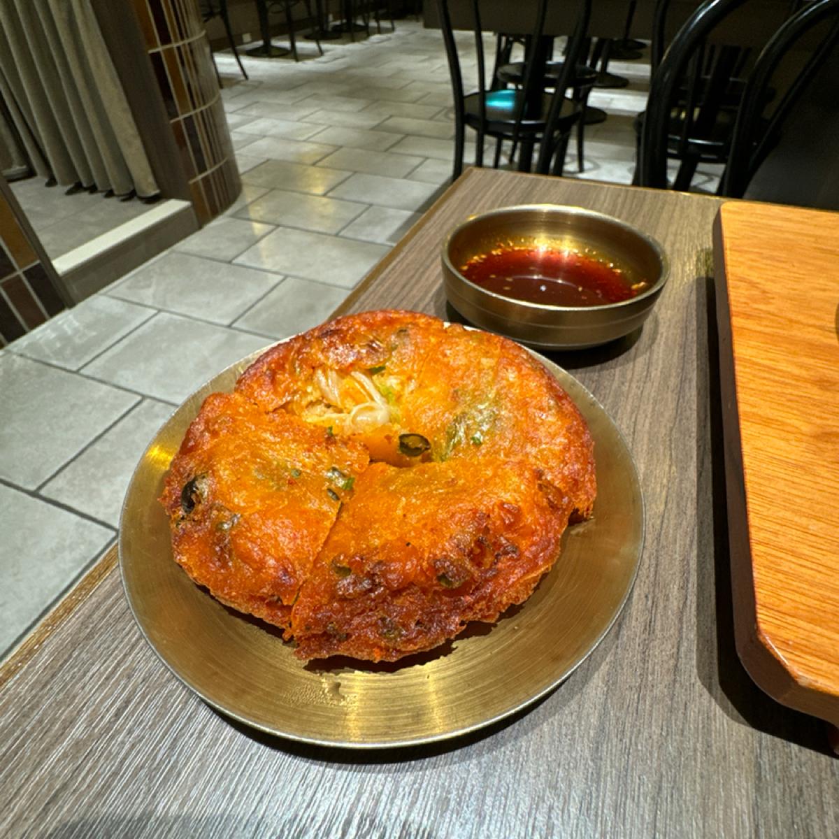 -迷你泡菜煎餅-150-大小大約手掌大而已。與一般煎餅不太一樣。做的比較厚一點,外皮有一層脆皮,裡面麵粉感比較多一點,泡菜本身的味道沒有很明顯,個人覺得普通