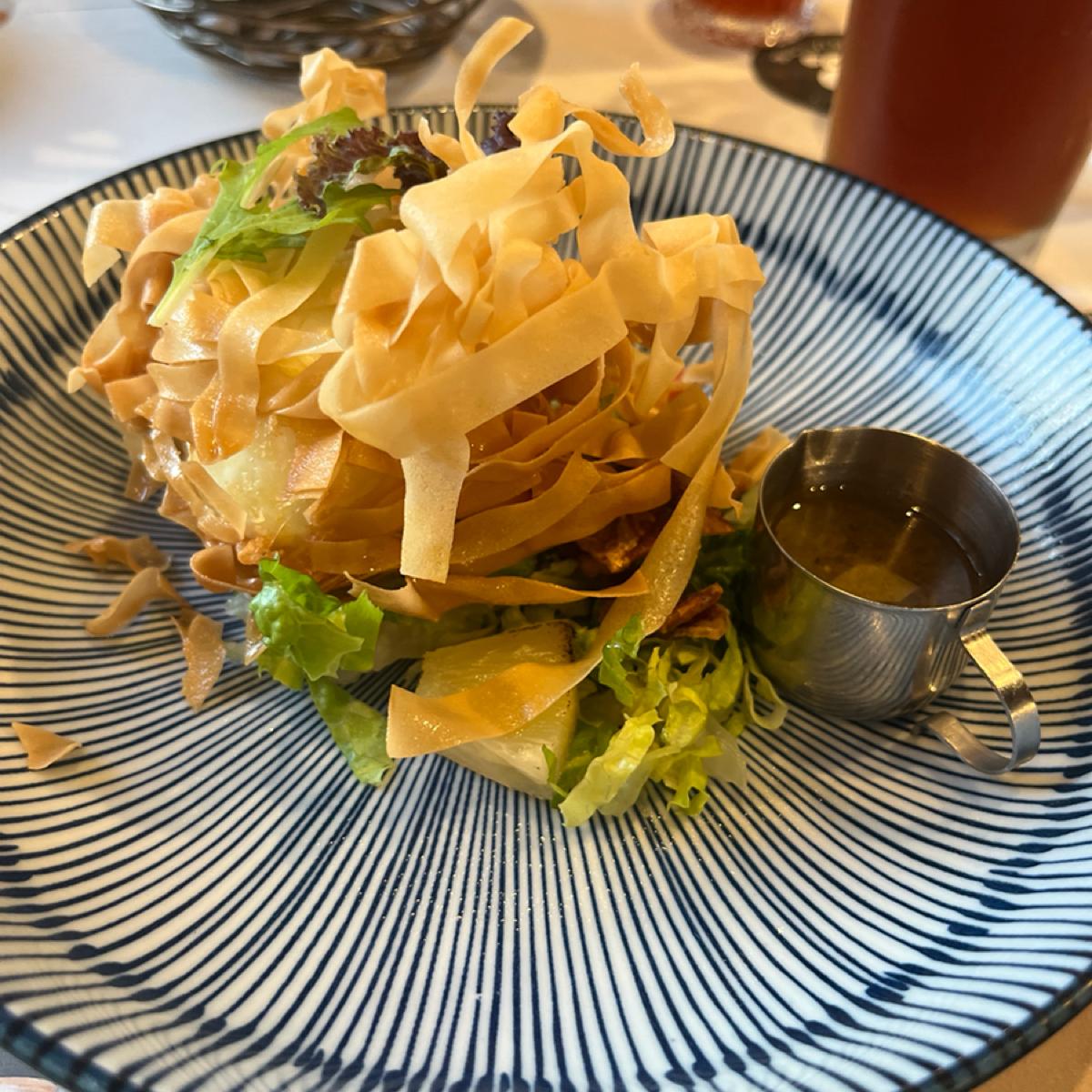 整顆溏心蛋外頭裹著春捲皮下去炸,搭配少許生菜、培根油醋醬