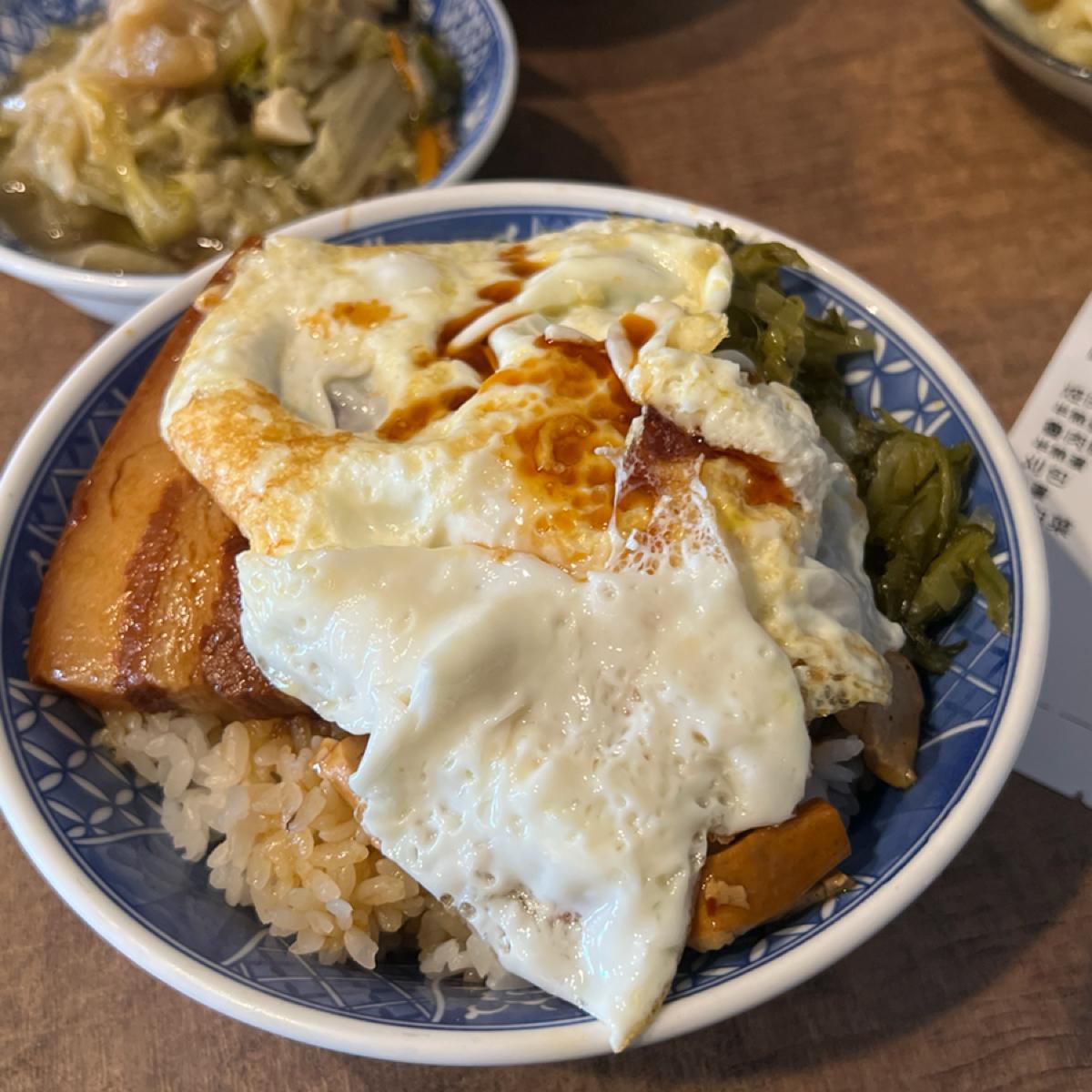 控肉飯上桌完全不手軟,一整塊滷得入味的三層肉直接蓋在飯上,肥瘦比例剛好,鹹香微甜不膩口,搭配半熟蛋一起拌飯吃,整體口感很加分。魯肉飯是碎肉偏油的那種,味道還不錯,就是比較常見。