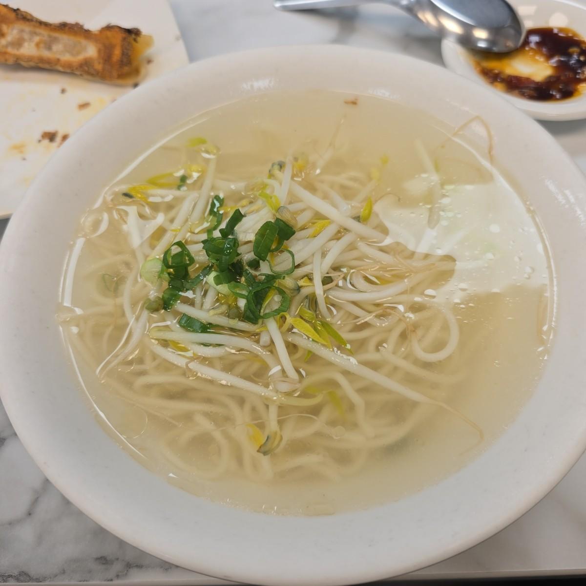 是相當清淡的湯底,只用少數豆芽跟蔥花點綴著麵條。