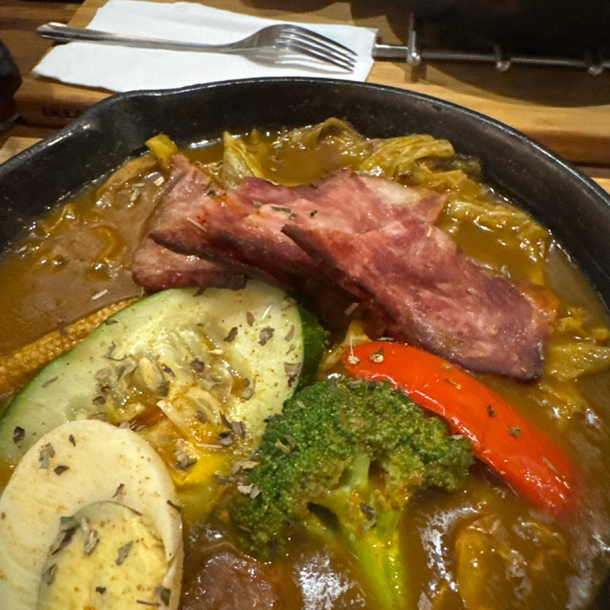 此次點炙燒培根高麗菜湯咖喱,推薦的中辣完全不辣,不太吃辣的同伴也說完全沒辣。也沒有炙燒培根也沒有炙燒香,就是一個稍微有點難咬的普通的厚培根!