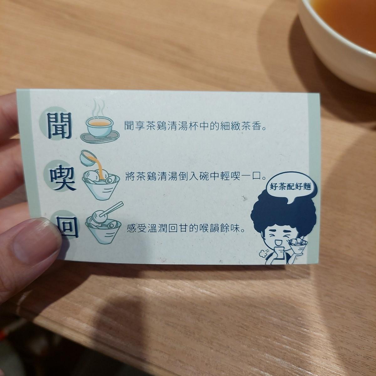 細麵的口感細緻溫和,店家會同時送上茶雞清湯跟拉麵,並且給一張建議食用方法的小卡。