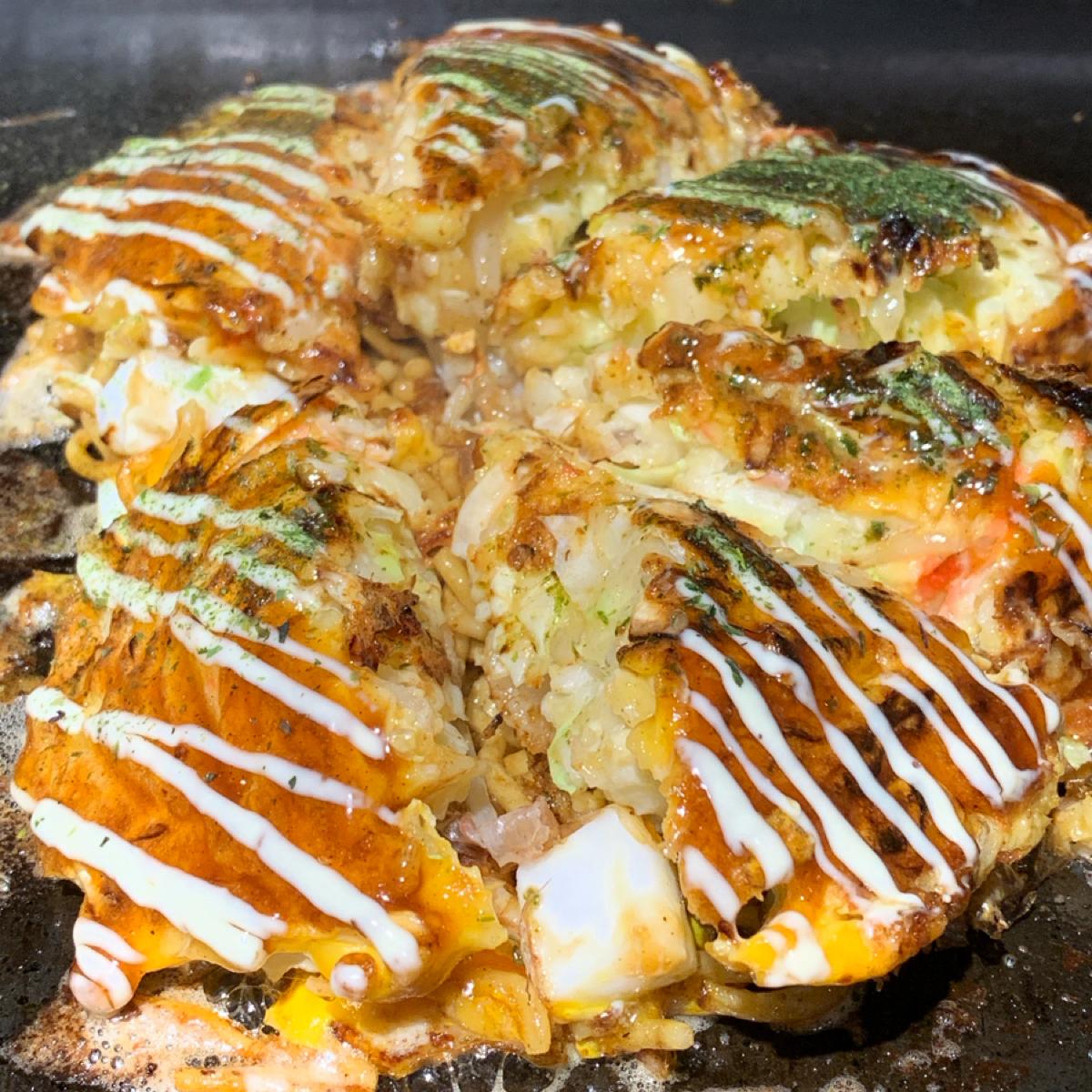 由於只能逐一料理、食用完才煎煮下一道,料理第三道時,已是一個小時後了。最後一份是廣島燒,店員會直接現場烹調完成,煎香培根豬,再以柴魚和蛋液合併炒麵,淋上美乃滋而成,還會弄成愛心形狀,焦香味十足,味道更複合,個人喜歡勝於文字燒。