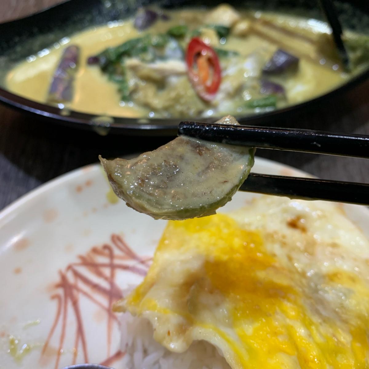 先點了泰式綠咖哩椰汁(雞肉片)飯,咖哩汁味辣且甜,泰國米飯偏乾,適宜加醬,飯上附一份煎蛋,雞肉片則無特別表現,幾條四季豆,倒是有近乎半顆茄子份量。