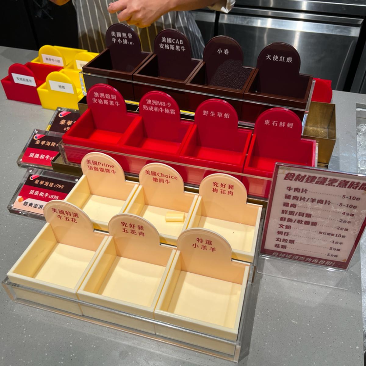 🧾 入場前要先在櫃檯選好價位,會拿到不同顏色的夾子才可入座。肉品和部分海鮮是用夾子點的,投進專用盒子後由服務人員現切送上桌,其他像蝦子、蛤蜊、火鍋料等就是自助式取用。