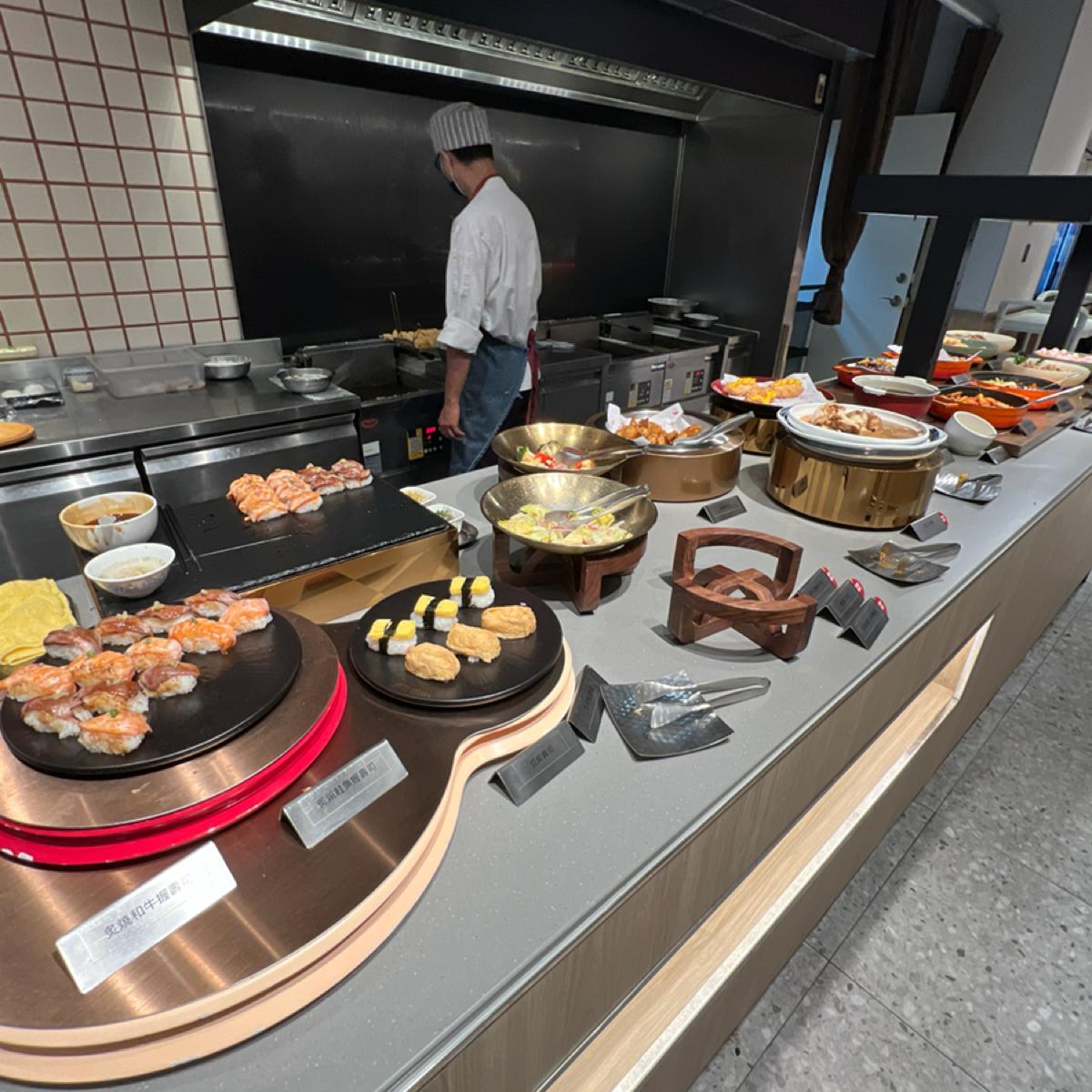 🍱 自助吧種類很多,有握壽司、炸物、熱食、涼菜、蔬菜區、甜點、飲料冰淇淋(哈根達斯+24濃作)。拔絲地瓜是我上次吃過就記住的,這次也是必拿,外脆內綿,熱熱吃很爽~握壽司這區表現就一般,不推。