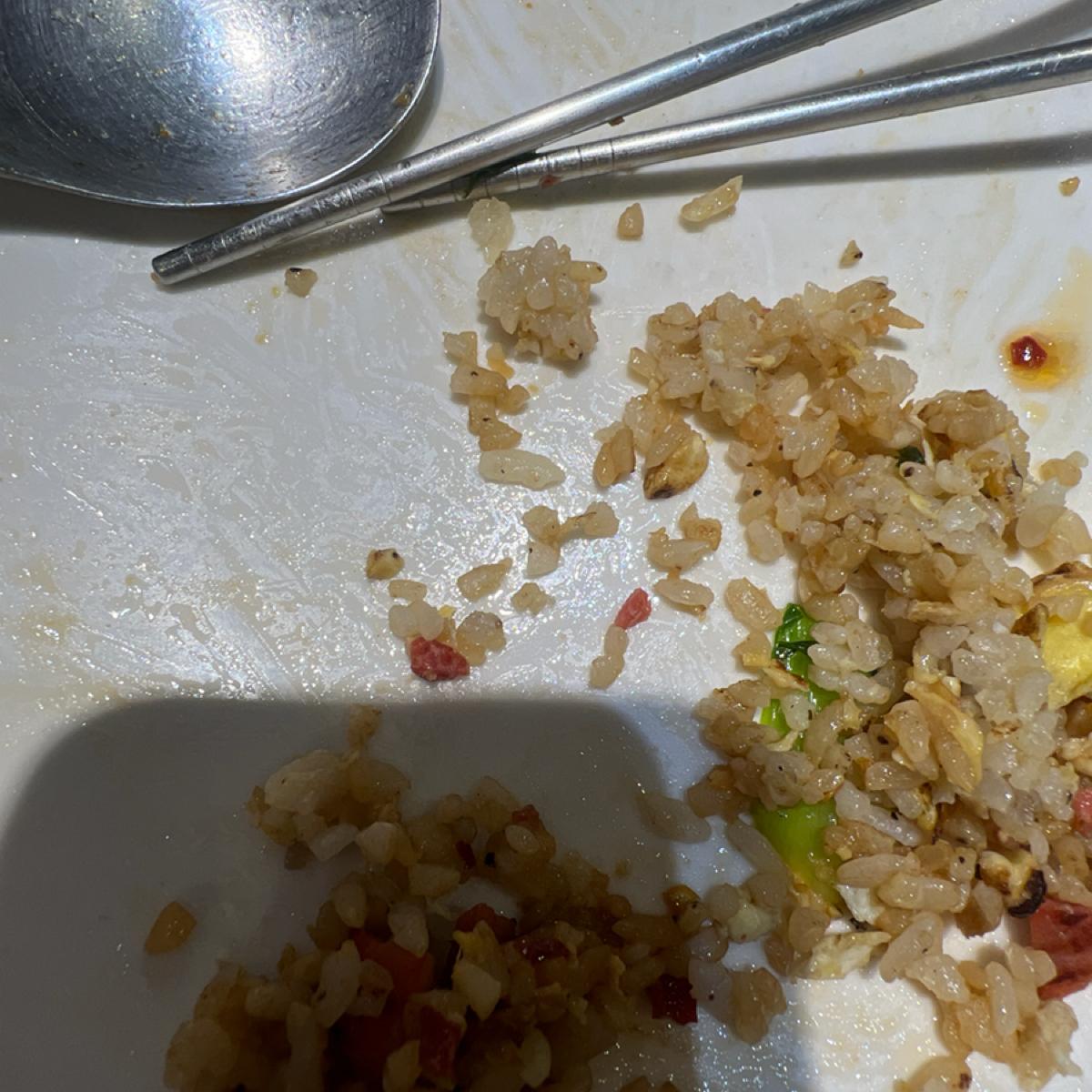 既然沒得選,只好點炒飯,結果更傻眼。端上來時看起來還好,但吃起來居然有苦味跟焦味,仔細一看,飯裡有一些黑色小點,推測應該是鍋子太久沒洗,或是上一份餐的焦渣沒清乾淨,就直接拿來炒飯。這種苦焦味的炒飯居然還賣一百多,真的不行。