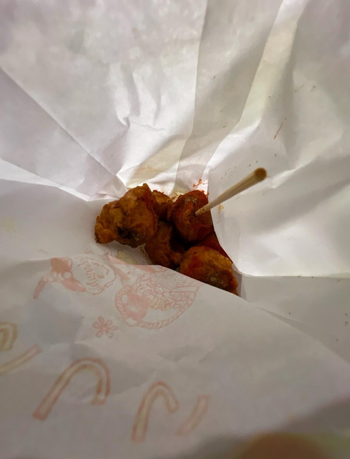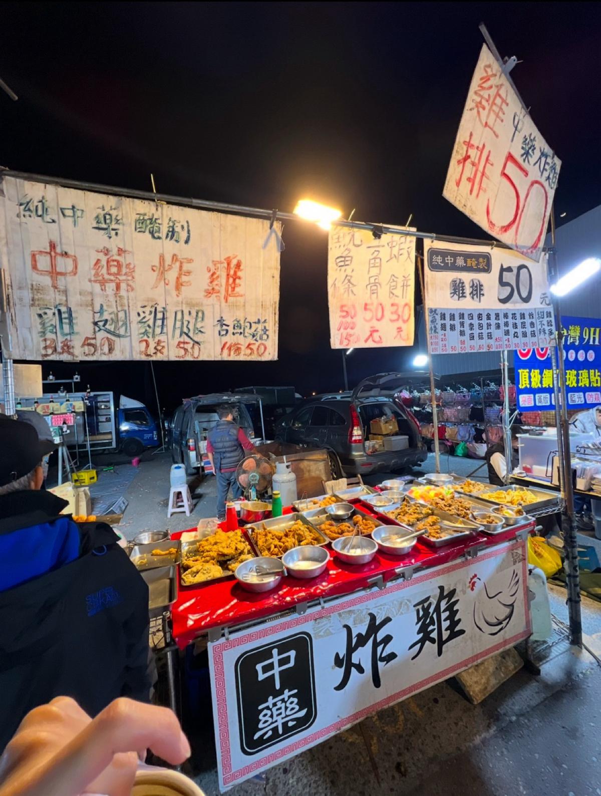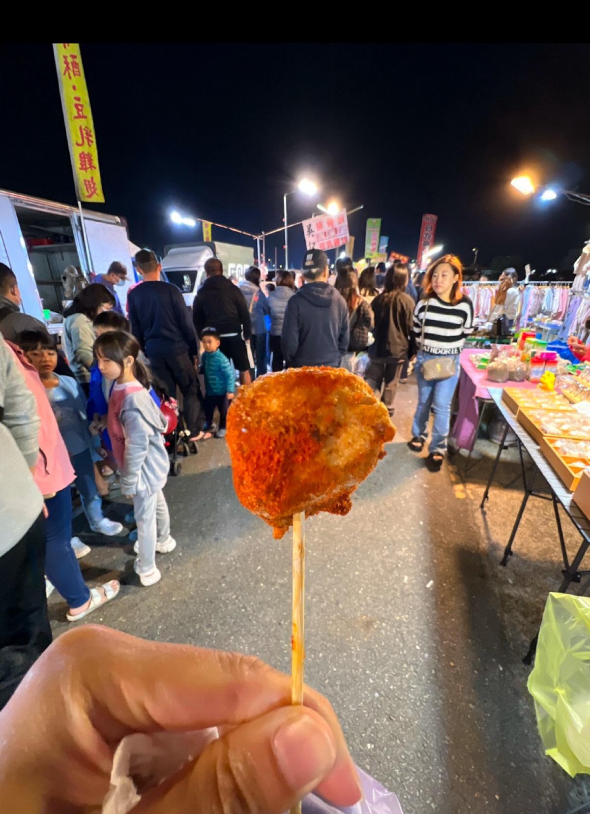 這是一家在斗南夜市的炸雞店,看起來招牌非常的舊,上面的字都褪色了,不過我就在路過的時候聞到他們現炸的花枝丸,那個香氣非常的香,色澤金黃色的看起來很好吃,油亮油亮的,所以就買了幾顆來試試味道。