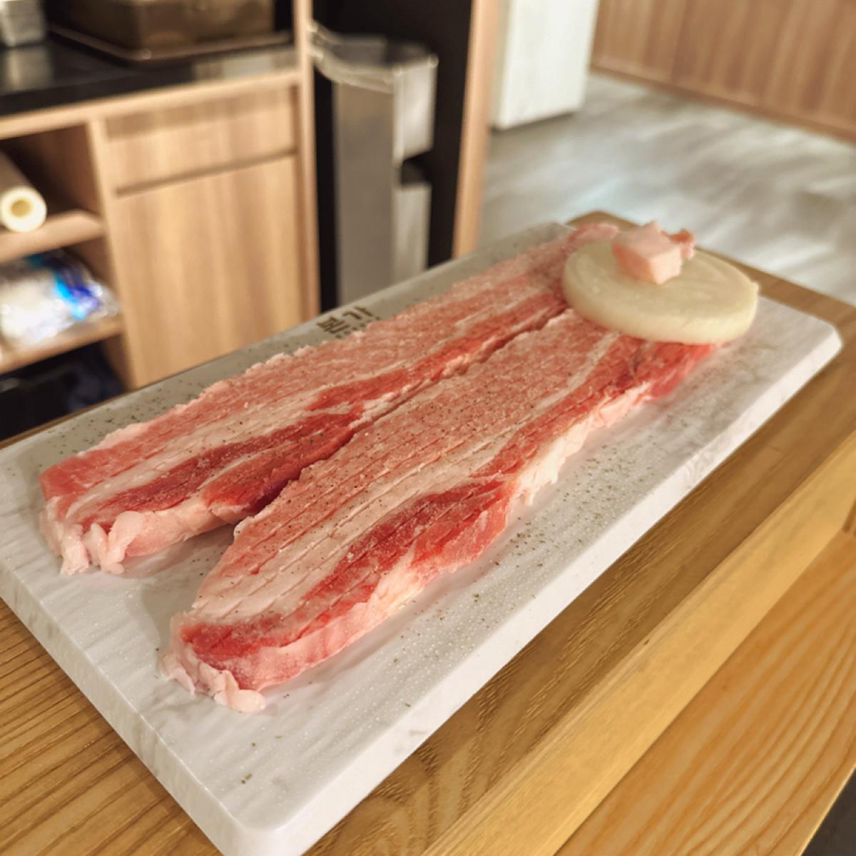 超級好吃,比一般到五花豬更有嚼勁,肥肉跟瘦肉的分佈不像一般的五花肉一樣很分明,反而有點像做過微整形之後的肉,瘦肉肥肉很巧妙的交織在一起,但又很自然。很奇妙的感覺,但我大推!