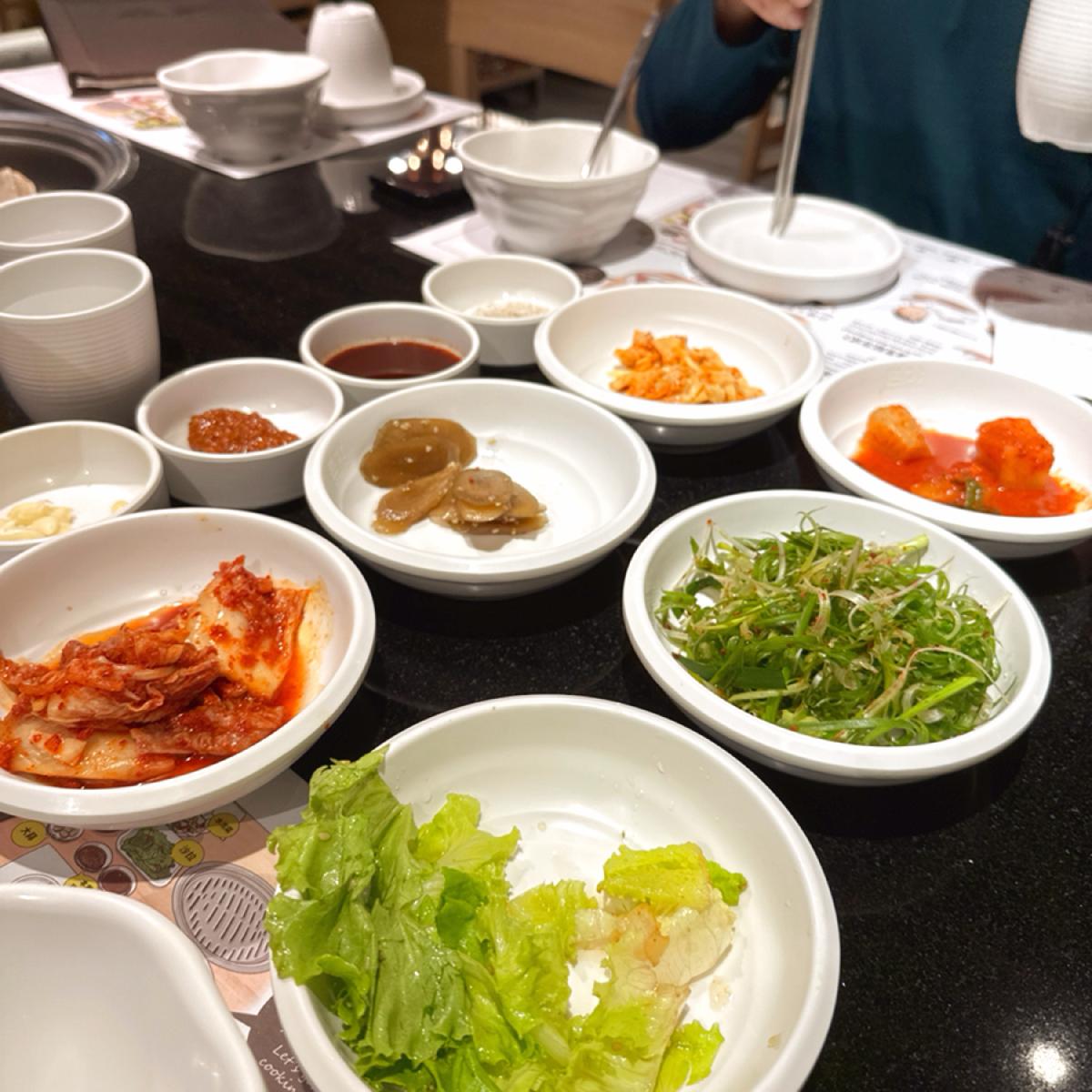 裝潢很新穎的韓式烤肉餐廳,座位很多,一入座就有很多小菜跟一大盤包肉生菜,開場印象蠻不錯的。