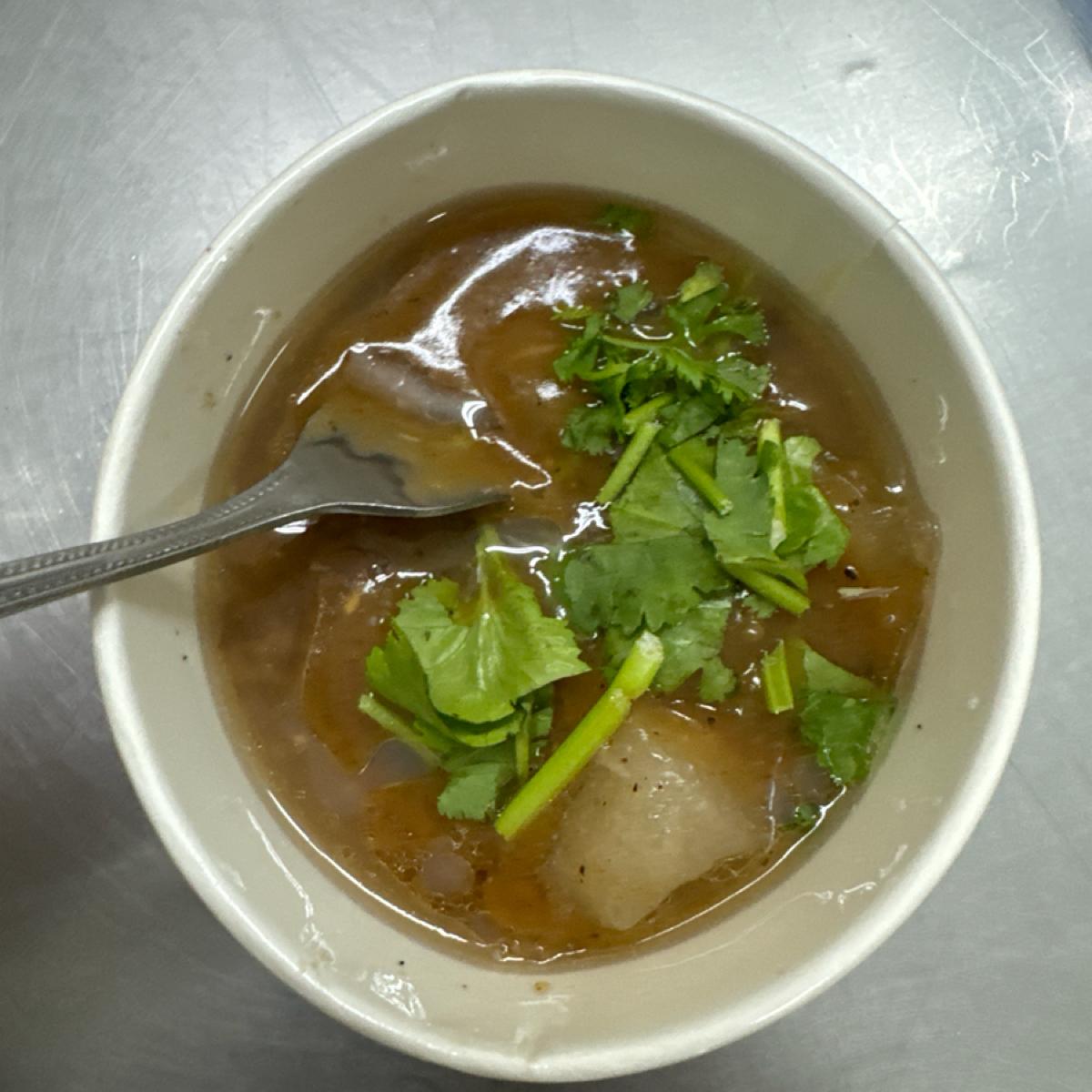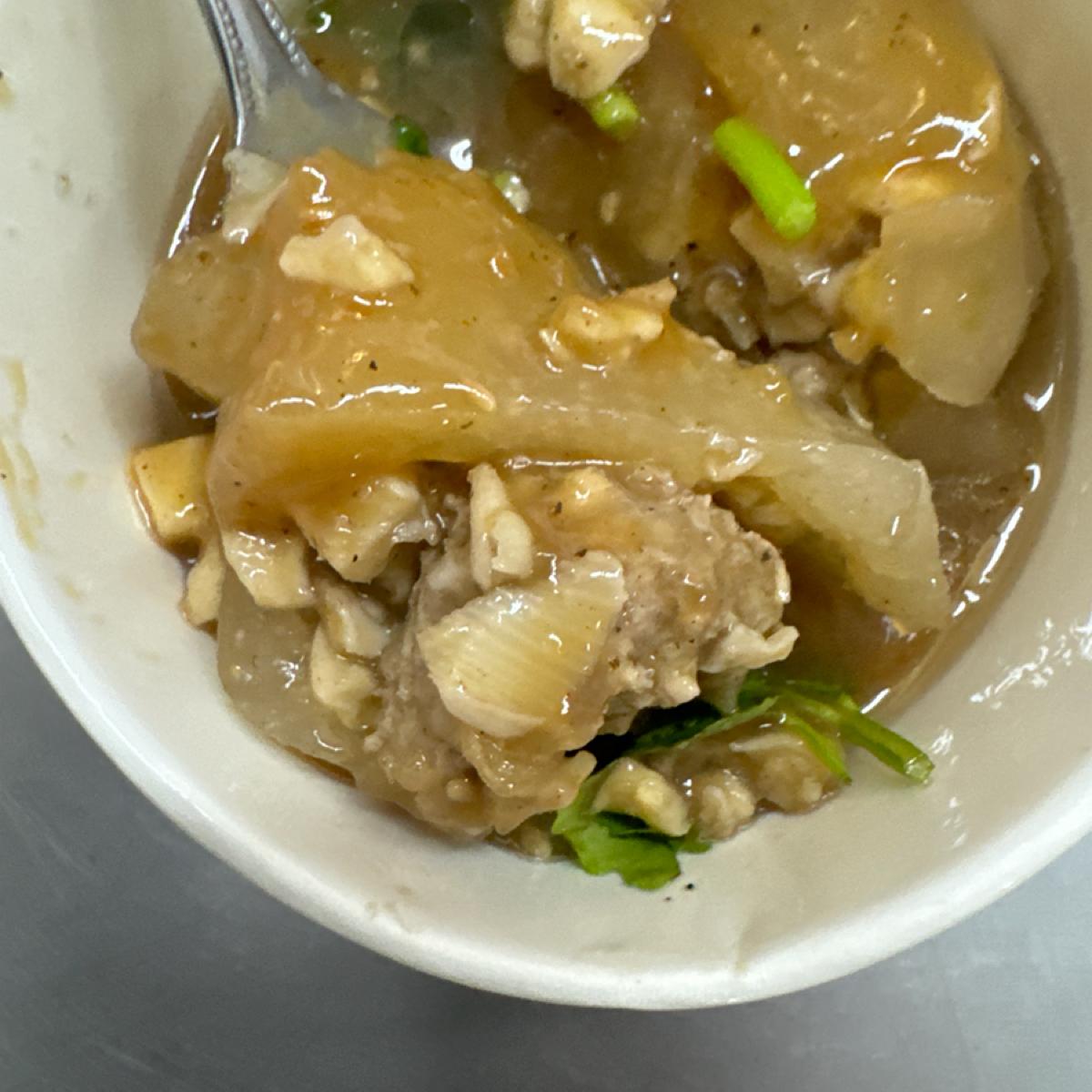 肉圓-一份兩顆-50-皮比較Q,皮的溫度比較燙口,醬汁偏稀,裡面的肉是瘦肉,一小球帶有中藥味,筍子滿脆硬的。不過整體滿油的,個人沒那麼喜歡。如果兩家比較的話比較喜歡肉圓生一點。