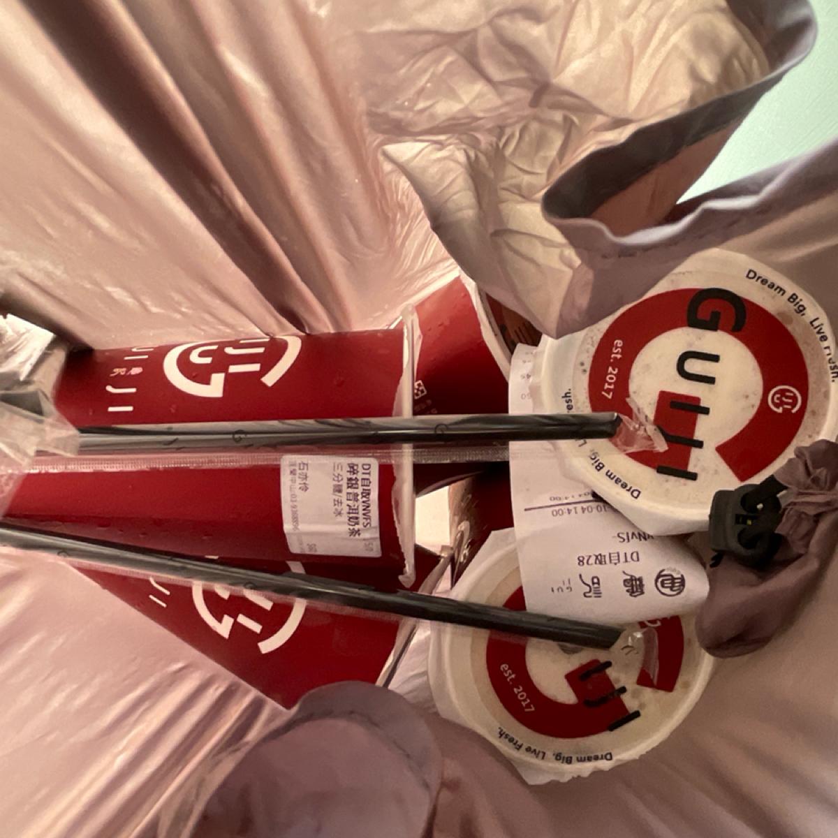 龜記的飲料蠻多果汁類的,楊桃系列感覺很有古早味(?)比較少在其他手搖店遇見,之前喝過他們的招牌紅柚翡翠,有蠻多果肉覺得還不錯,清爽感很適合夏天,這次點了碎銀普洱奶茶,普洱跟奶茶搭配我第一次喝,沒到很不搭但有點小不習慣。