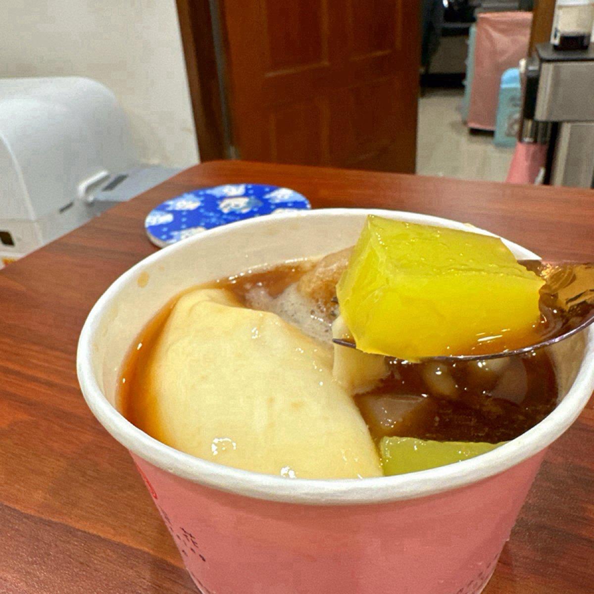 麻糬般的軟糯與傳統的滑潤,竟能同時存在於一口之中,對牙齒與舌頭的回饋竟能如此變化多端,再加上浸潤了冰涼的糖水...... 豆花在口中好像有了生命力,一瞬間覺得,自己嚼的是鮮活的豆花史萊姆,而這確實顛覆了我對豆花的印像,令人驚豔。