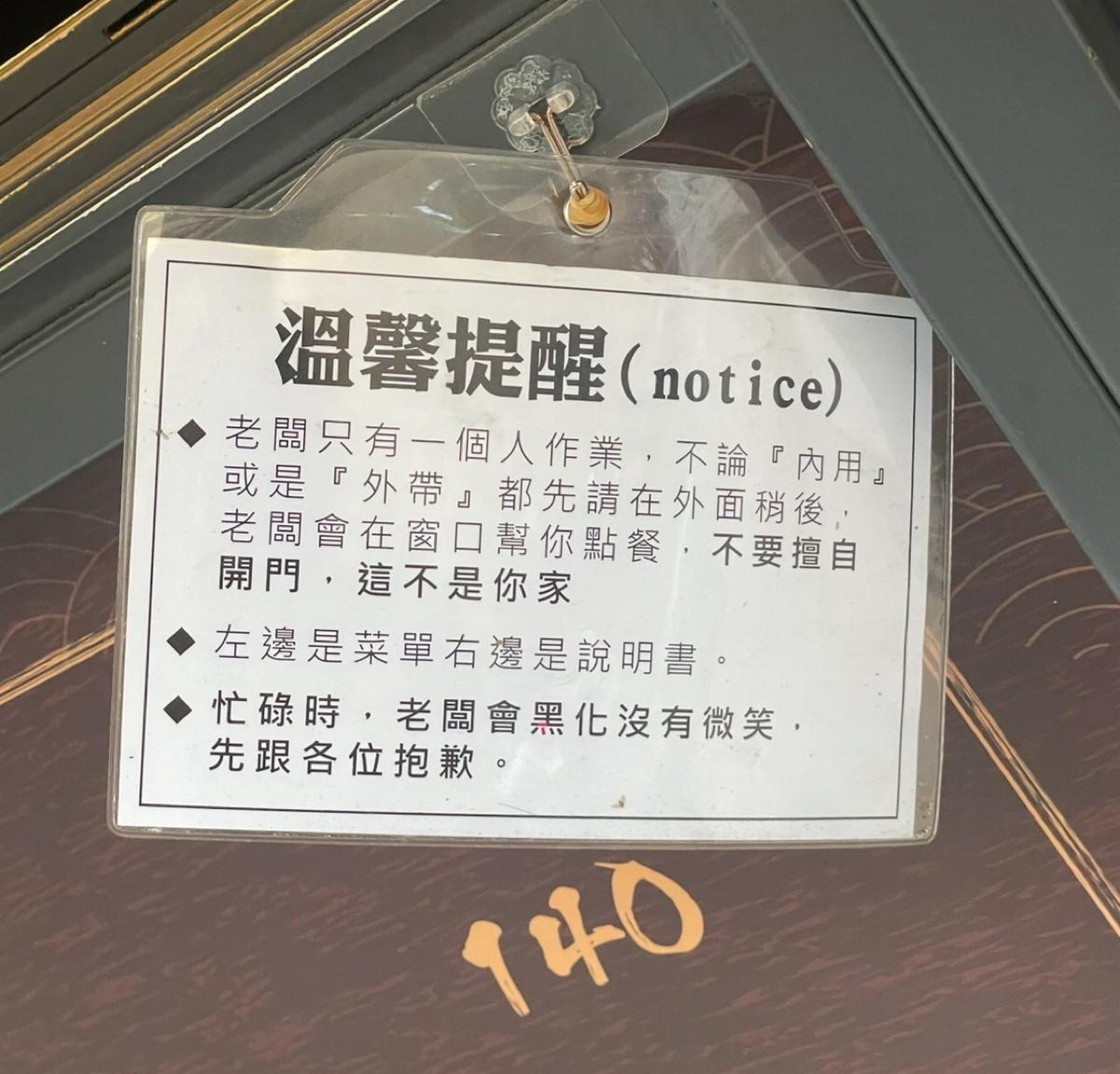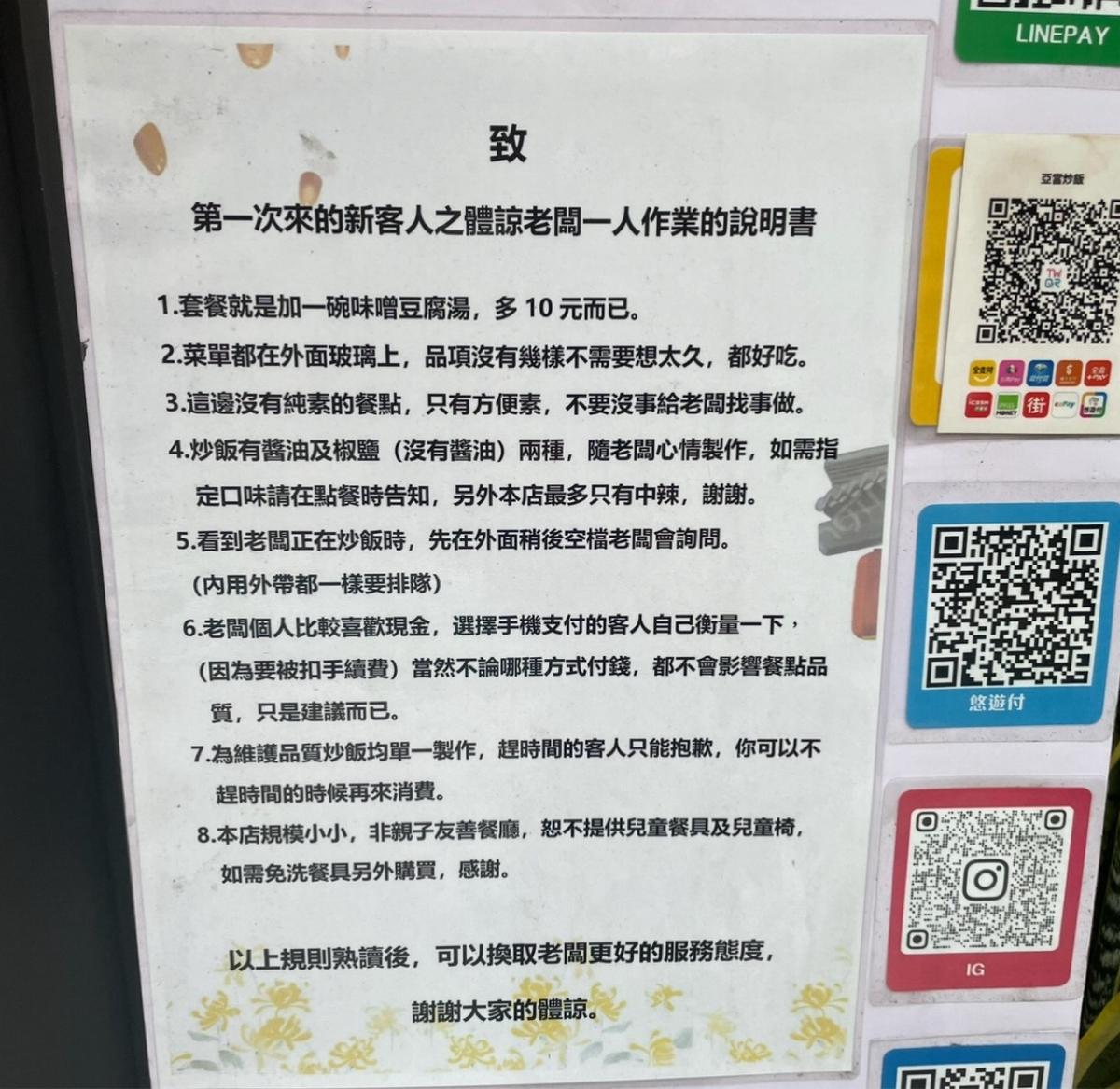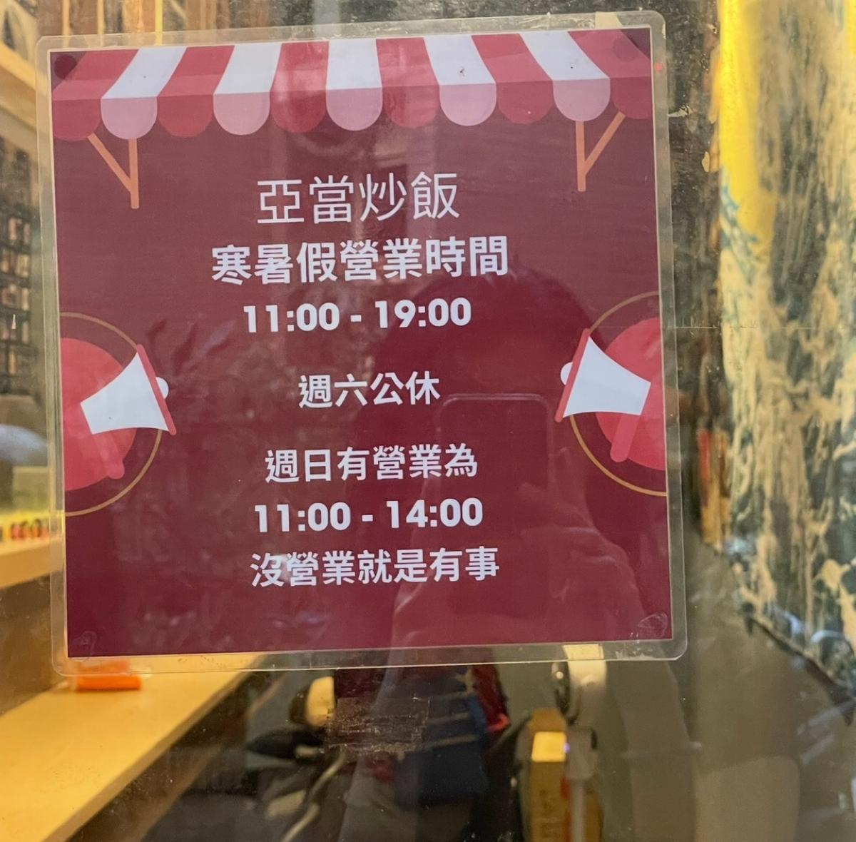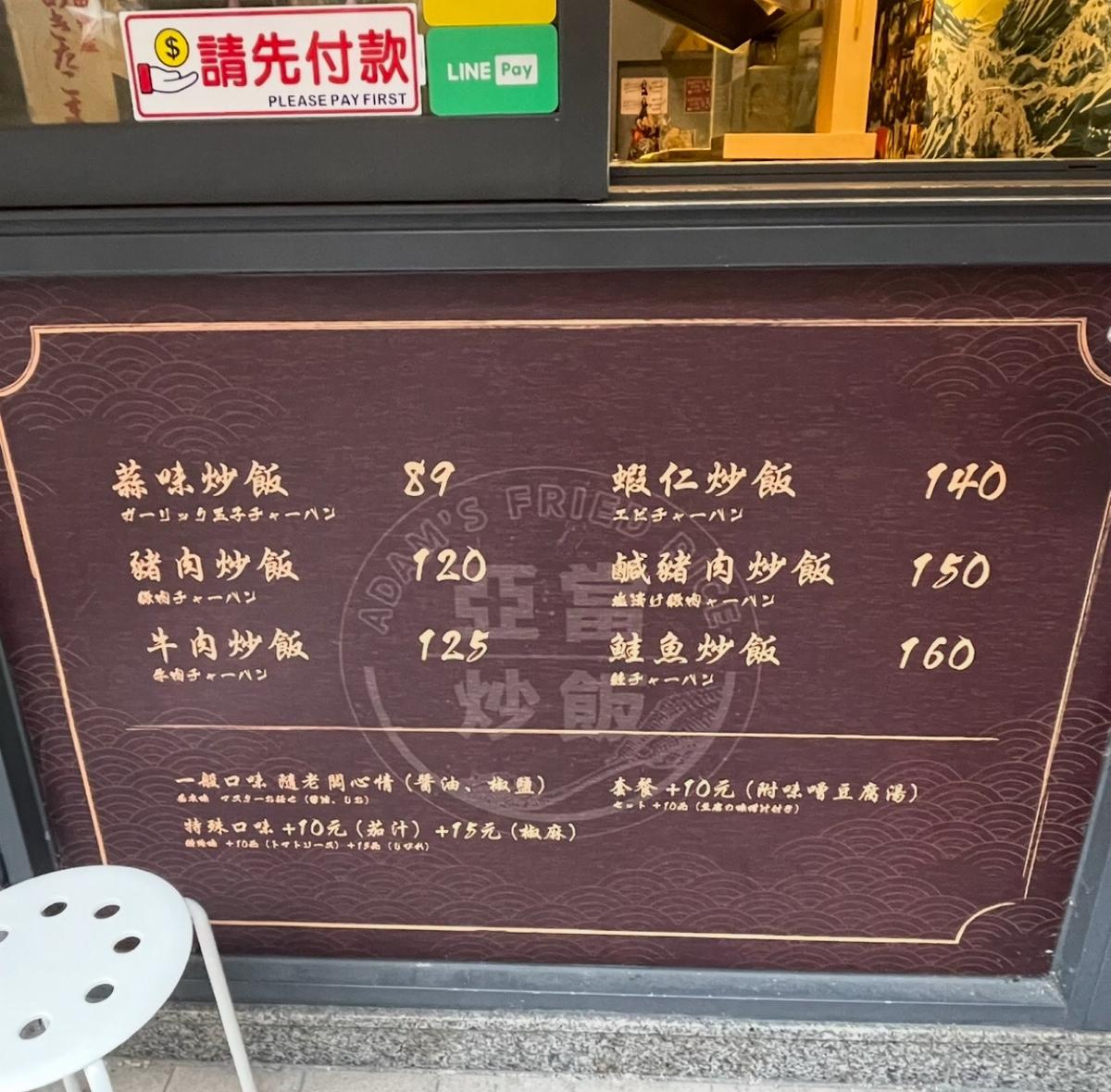 「亞當炒飯」的老闆很有個性,千萬千萬不要在老闆沒有開口前就直接推門進去,需要站在門口等候老闆詢問要內用還是外帶,如果要內用的話,也是先點完餐之後才入內,直接走進去的話會被罵
