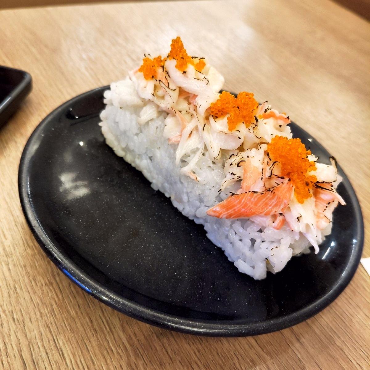 一份三顆花壽司呈現,上頭舖滿吃起來像蟹肉絲跟蝦卵,壽司內有蛋絲、生魚一些經典的料