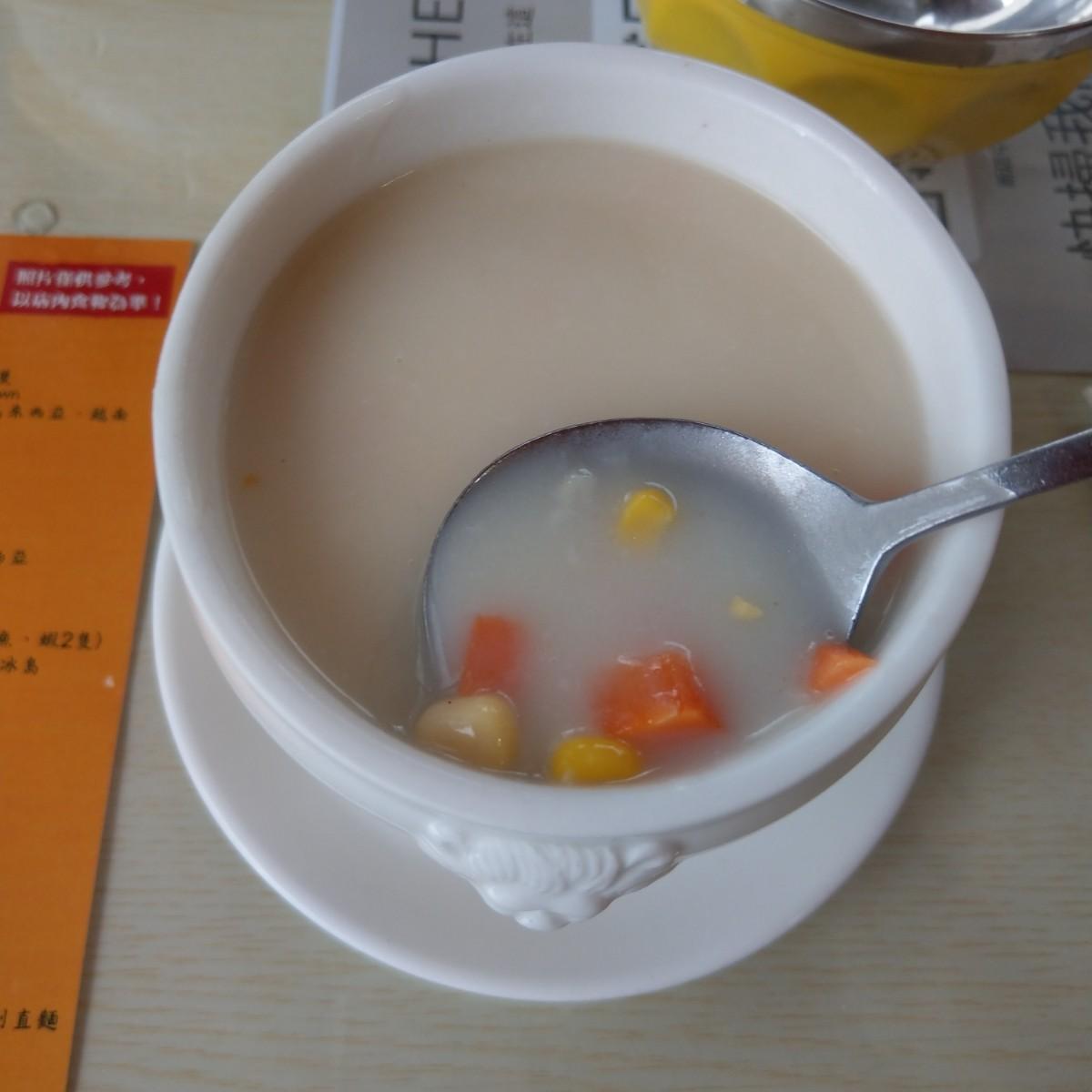 配餐B 玉米濃湯+奶油麵包:裡面有少許的玉米和紅蘿蔔,感覺是太白粉勾芡出來的濃度,沒有奶油香,喝到一絲絲酸味。麵包沒什麼記憶點,普通的好吃。