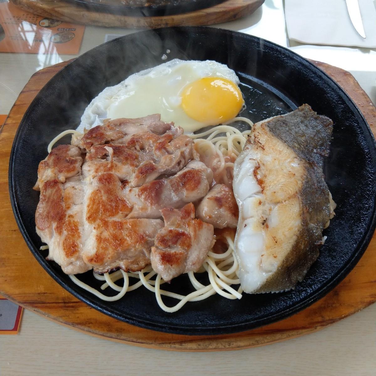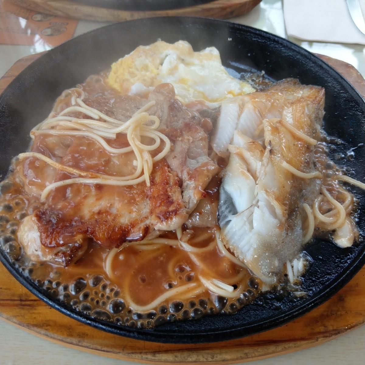 雙拼(雞腿排+大比目魚排):雙拼是用大尺寸的圓形煎盤裝,送上來後要自行淋醬,我選了蘑菇醬,口味偏甜蘑菇味濃厚,令人驚艷。雞腿排咬勁很好,只是有少許筋比較難咬;比目魚排份量偏小,但吃起來也是不錯。