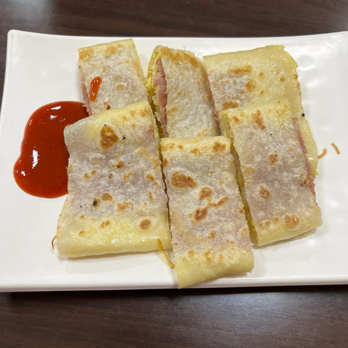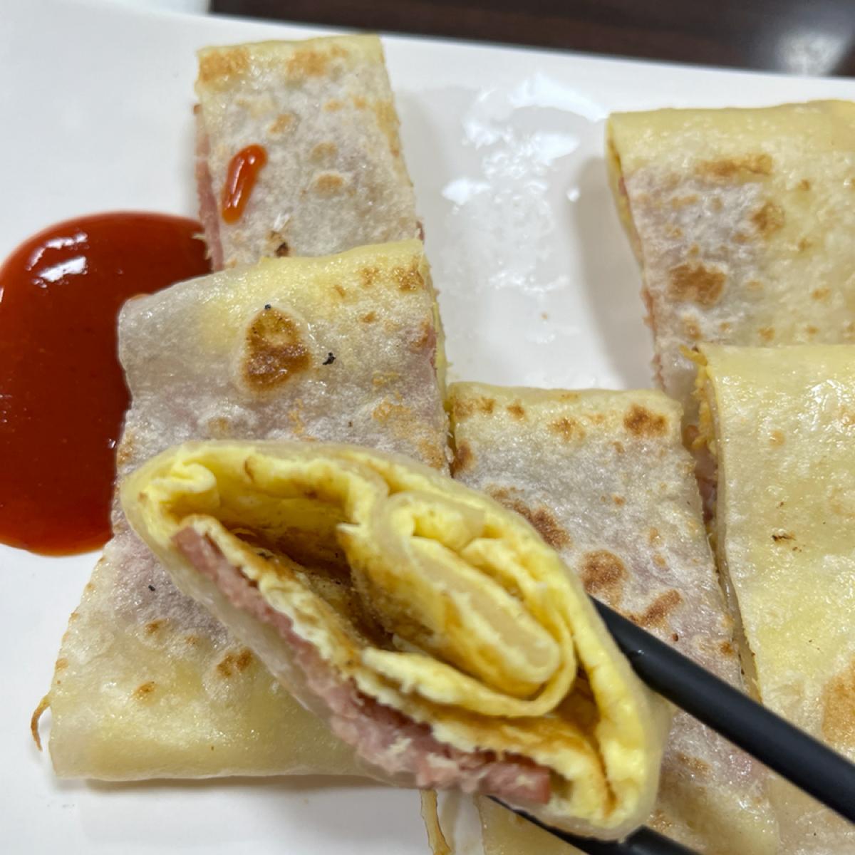 這次點的是培根蛋餅$40 他們家的蛋餅吃起來是屬於乾爽的,有的店家吃起來是很油那一種,他們家不是。所以餅皮有酥脆的感覺。