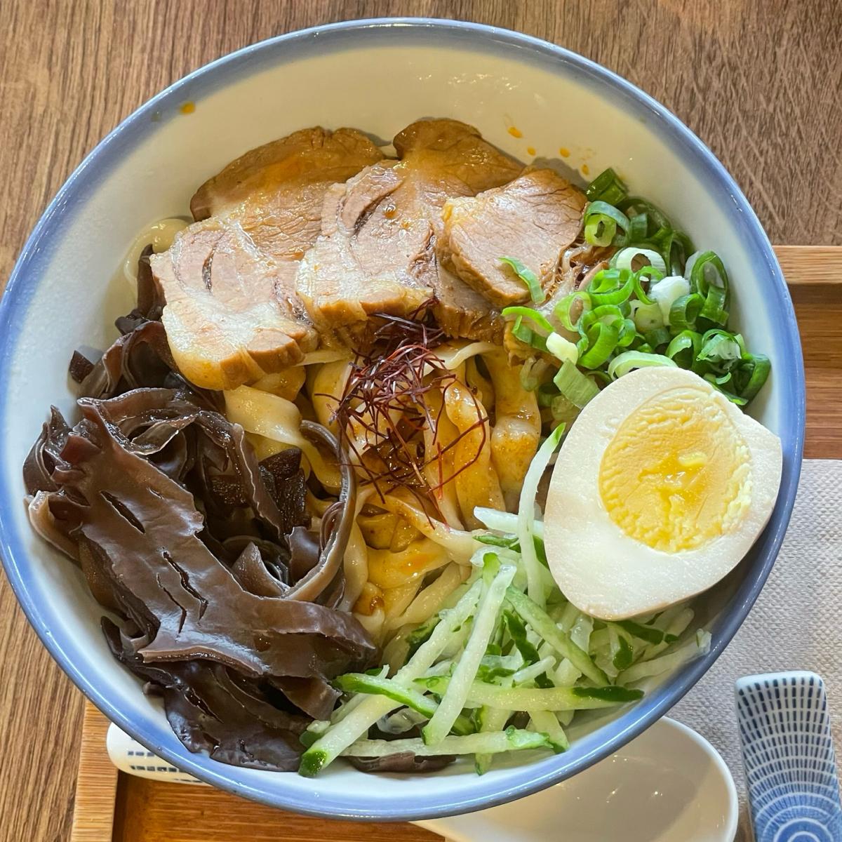 兩碗麵都有豬肉叉燒三片、半個溏心蛋、蔥花、木耳、小黃瓜絲