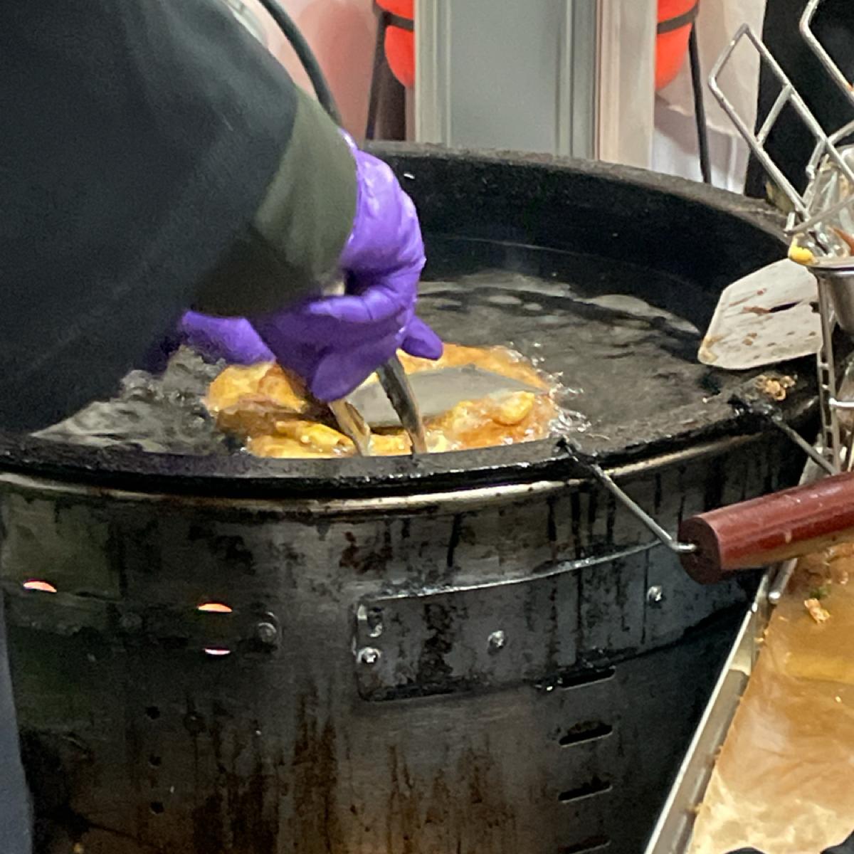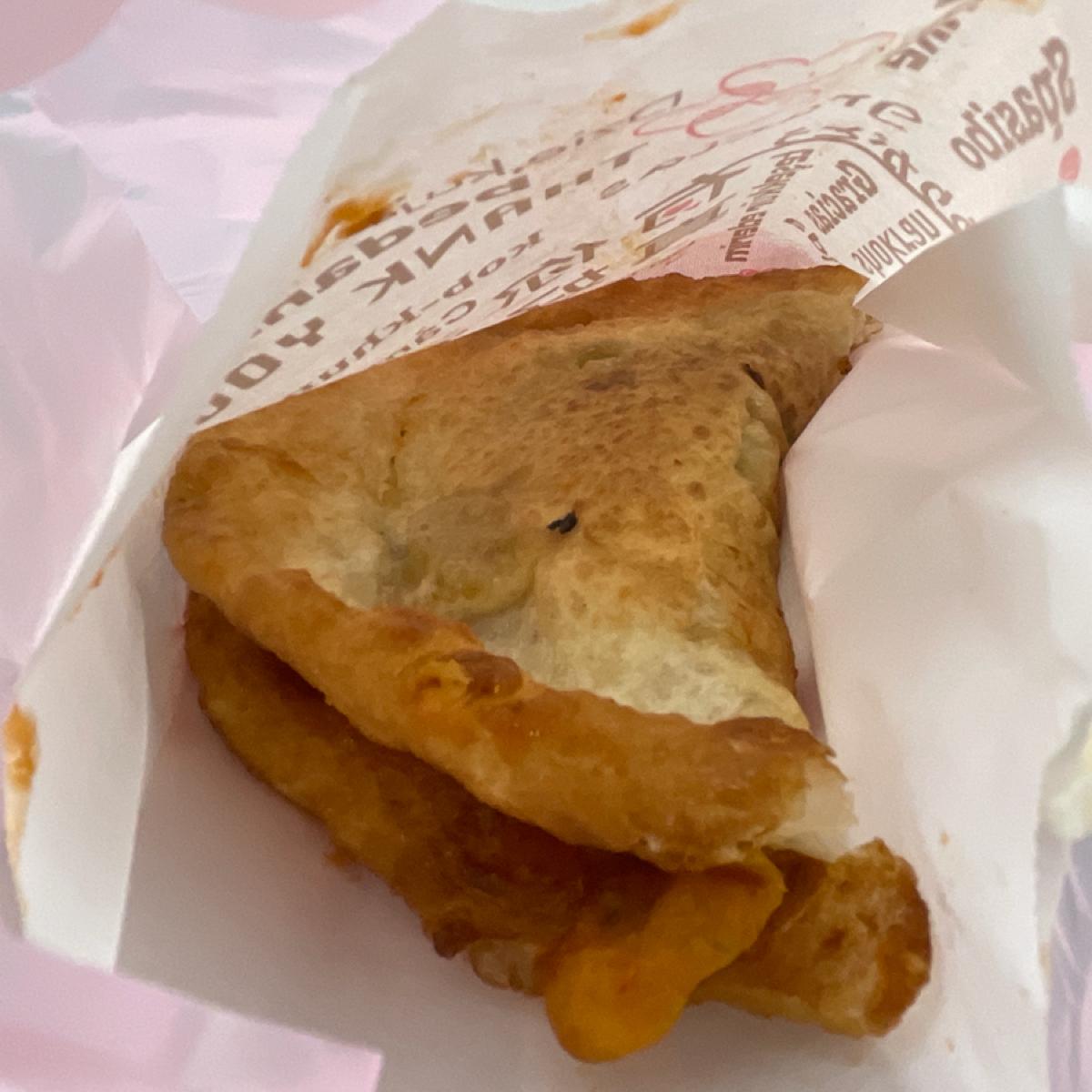 宜蘭很多家蔥油餅,阿嬤蔥油餅是炸的,如果沒有特別指定他們會是加一顆蛋的版本,不加蛋或需要雙蛋需要特別告知,吃起來外面酥裡面是軟的,蔥是夾在中間有明顯味道的,加了小辣但吃起來不會太辣,覺得加辣更加分,久久吃一次覺得蠻好吃。 炸的很怕冷掉容易有油味,建議買完要儘速食用完畢。 阿姨態度親切熱情,他們還有販售古早味飲料、花生之類的東西可以選購,當天平日下午完全沒有排隊,覺得很幸運,之前他們在轉角處常常有路邊亂停車的狀況,現在改到新址斜對面有停車場可以停放,感覺比較好。