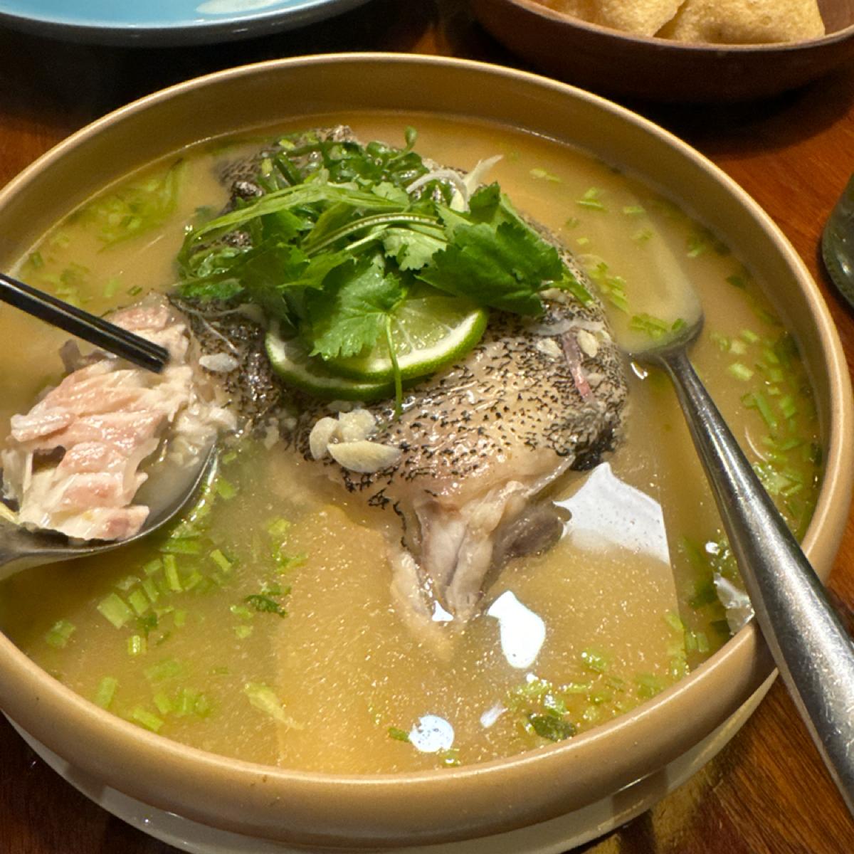 -清蒸檸檬魚-680-它並不是整條的魚,是大塊的魚片,有比較大根的刺。它們家是整個泡在湯汁裡面的,魚肉帶有彈性,酸度有進去魚肉裡面,吃起來不太辣,中規中矩。