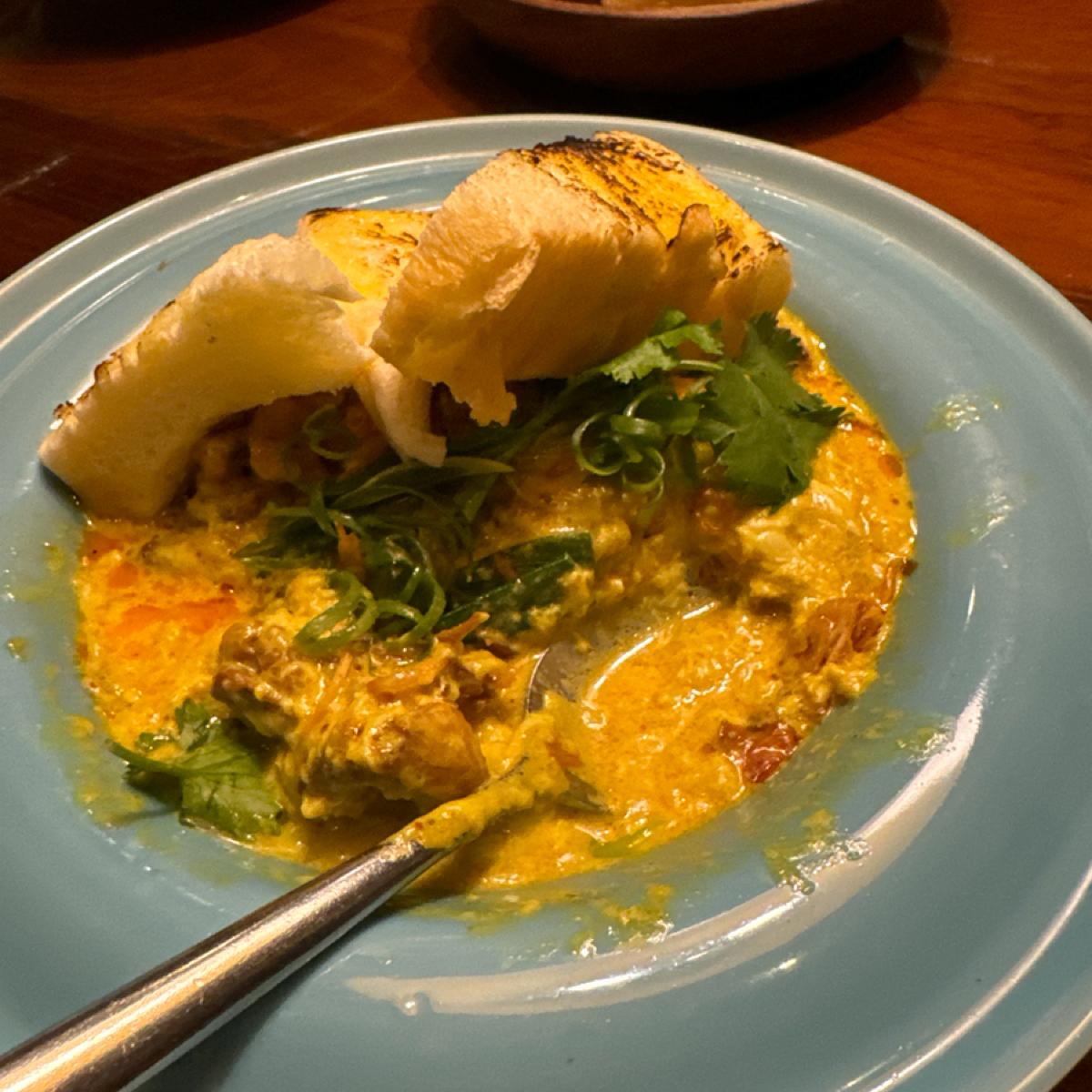 -黃金咖哩軟殼蟹-680-軟殼蟹好像比較多是吃到腳的部分,好像沒什麼蟹身的肉。咖喱醬汁的部分薑黃味滿重的,很香!而且帶有一點奶油感。蛋的部分比較偏細碎的滑蛋,個人比較喜歡有固體一點的感覺。上面有附四塊厚片吐司,有抹奶油,中規中矩。不過是今日第一喜歡的菜色
