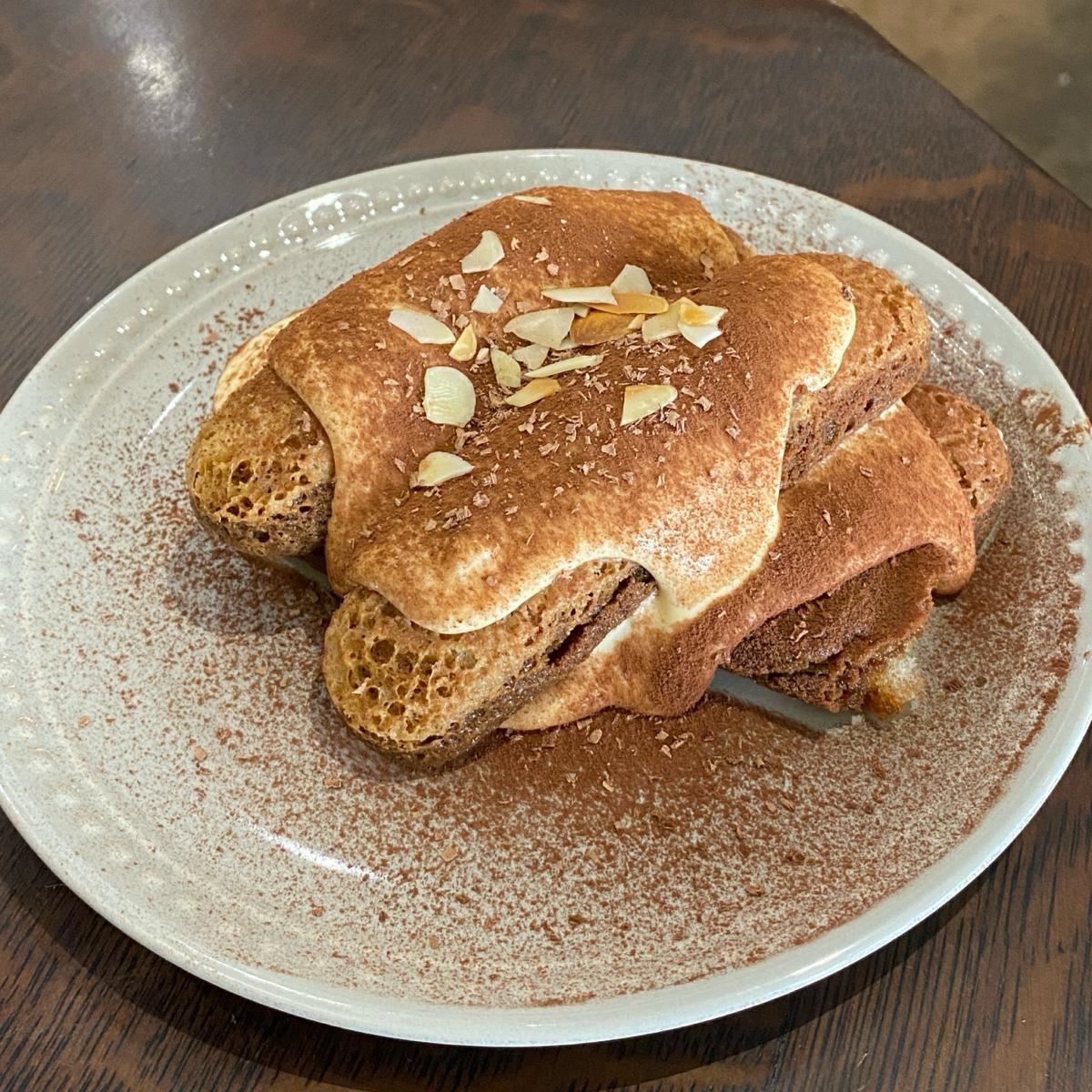 現點現擺很大一份!!入口有酒香直衝腦門,再來是咖啡、馬茲卡彭味,對我來說手指餅乾的口感有點太濕、加上馬茲卡彭也是偏液態一點的,整體有點濕軟濕軟……酒的香氣有點改過蛋糕本身該有的味道(卡彭、咖啡、可可粉),不過上面有杏仁脆片增加口感小小加分吧。稍微放久一點那個卡彭味比較有出來。