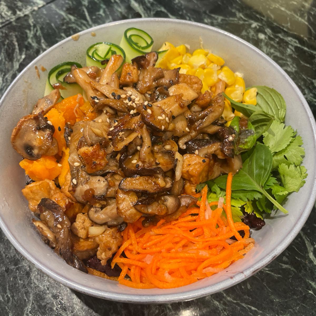 最底下是紫米飯,上面鋪滿玉米、小黃瓜、香菇、豆腐、南瓜、紅蘿蔔絲等食材,三杯口味蠻突出卻不突兀,吃起來很清爽健康,是一款很適合夏天吃的料理