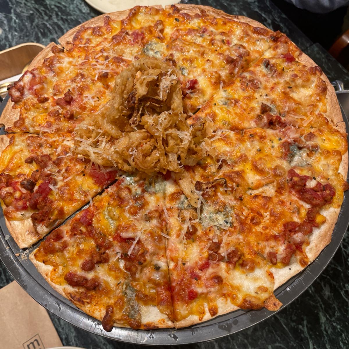友人吃到這一道時驚呼「哇好像真的肉醬喔」,我個人覺得是個經典好吃的披薩口味,上面撒上一些炸得酥脆的洋蔥圈蠻加分的!