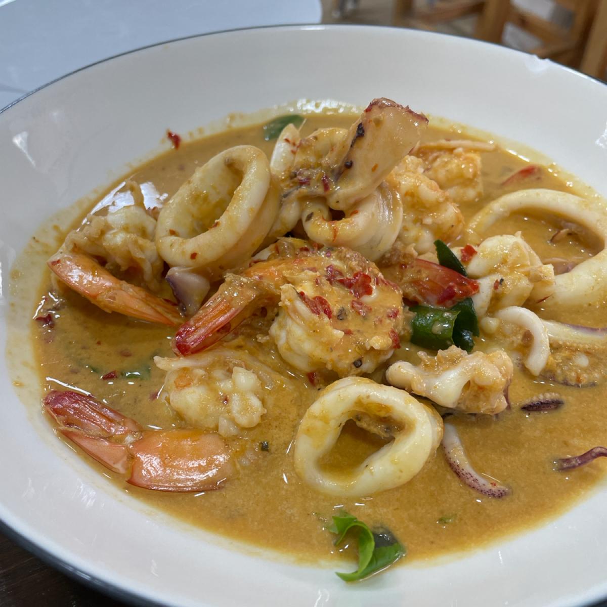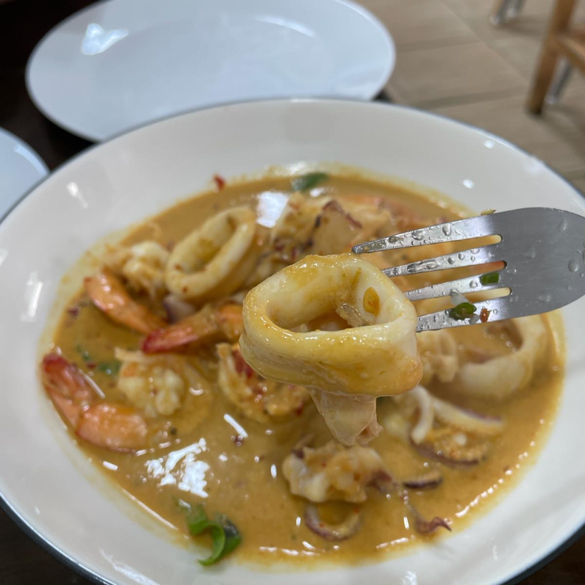 紅咖哩更是驚豔,簡直是人生中吃過最好吃的咖哩⋯不誇張 因為不習慣吃太多飯,那個醬汁我幾乎快單喝光⋯尤其蝦子跟魷魚味道真的好鮮,不是只是吃口感,海味真的拉到最滿,一開始超燙超辣好過癮,後來涼掉之後變得比較平易近人嚐得到椰奶類的甜味~~