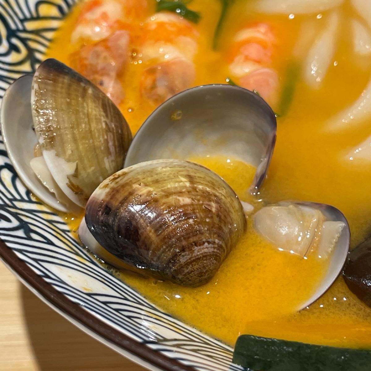 湯頭喝起來一點點辣,沒有到很酸,蝦子滿新鮮的有三隻。蛤蜊也有三隻,整體份量還行。烏龍麵 Q 彈有勁不會到太軟爛。