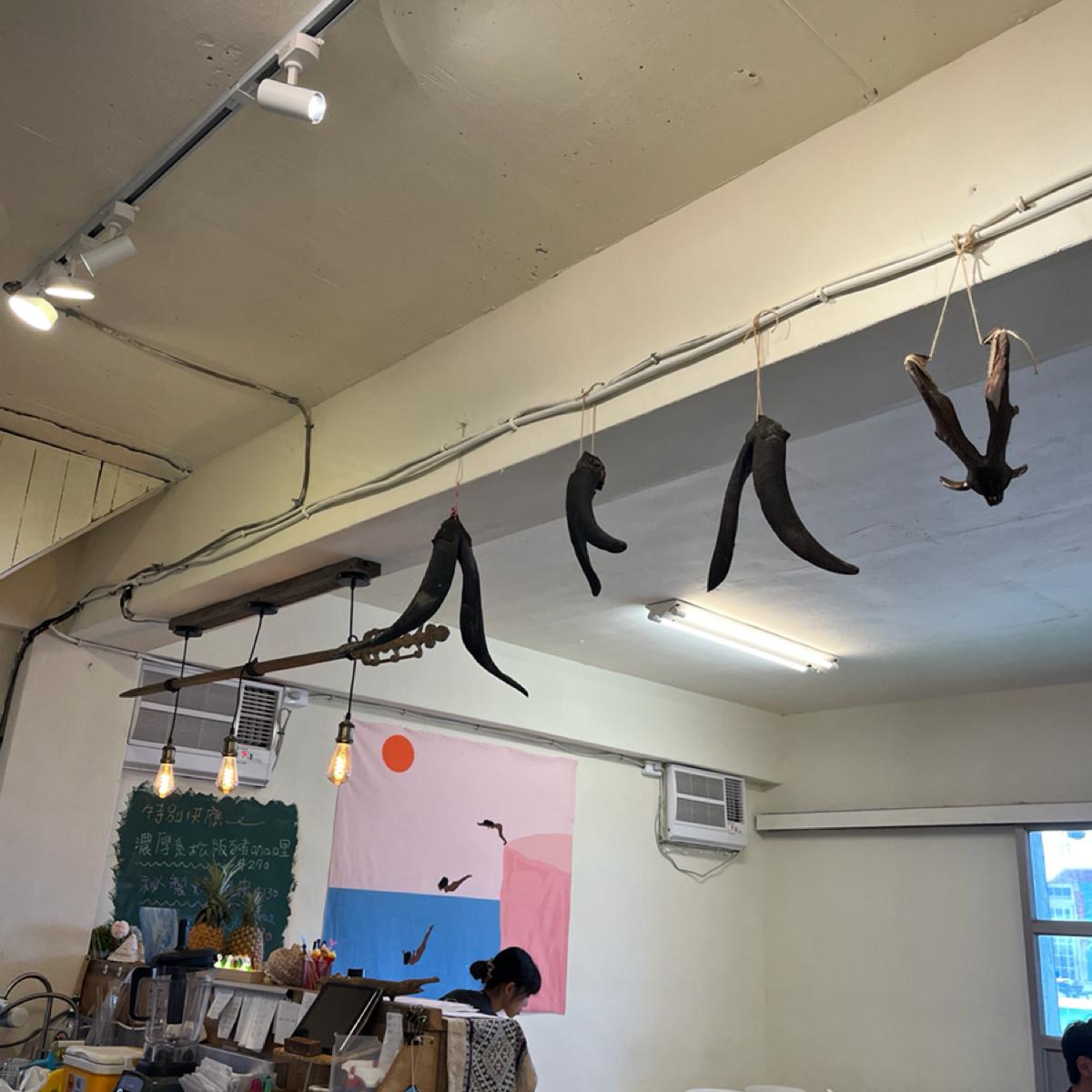 野銀部落因為本身的餐廳不多,所以出現像海廢食堂一樣主打環保和微文青的餐廳很難得一見。店裡頭有羊角還有畫布作為裝飾,如果要外帶的話,餐具也會另外收費,以希望可以達到垃圾減量的效果。
